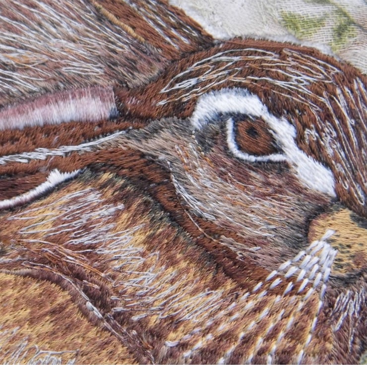 I was inspired to create this piece - almost without realising it - by the famous watercolour of a Hare by the German artist of the 15th/16th century: Albrecht Durer. I wanted the stillness of a passive Hare - sitting in the grass and hiding in plain sight. I used the sewing machine as much like a drawing tool as I could - following the curve and structure of the Hares form and coat.