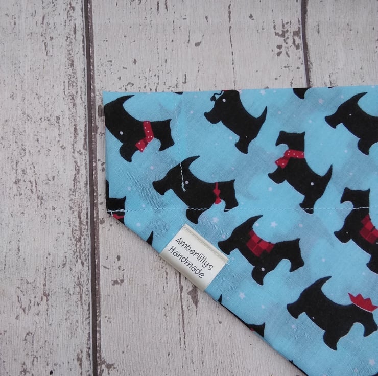 Especially for the Christmas season, this fun small over the collar dog bandana in polyester cotton. It has light blue background and black Scottie theme dogs in Christmas design.