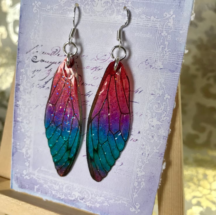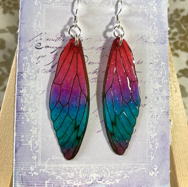 Beautiful fairy wing earrings in colourful shades of red, purple, blue and green.