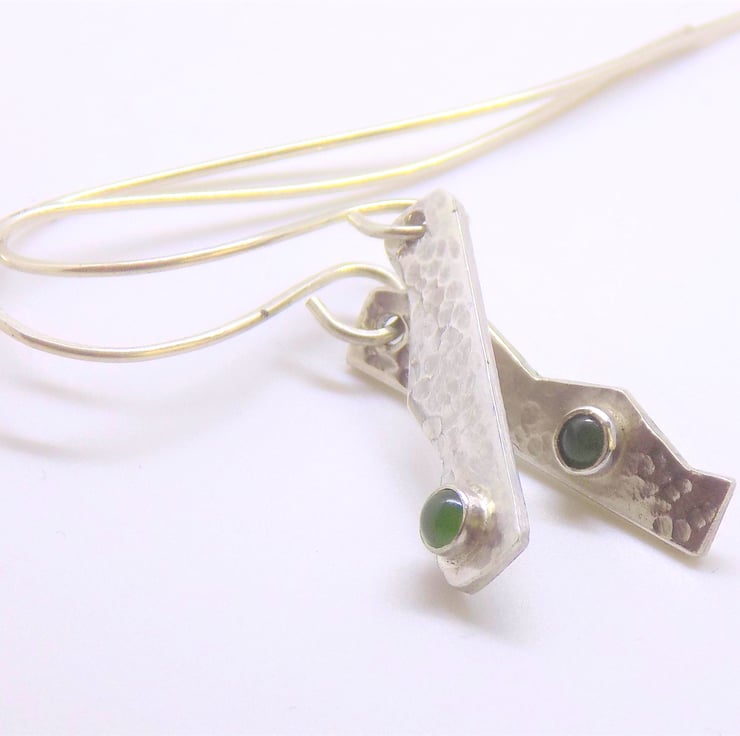 Handmade sterling silver earrings with 3mm natural jade. the earrings have been hammered to give a textured finish.