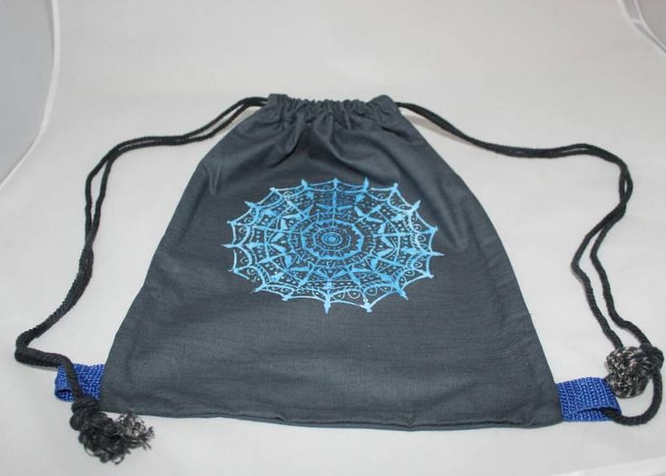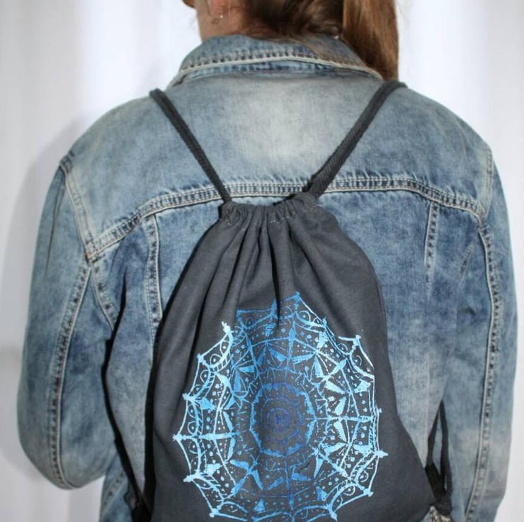 Handmade drawstring bag/ lightweight backpack, hand screen printed with my new geometric mandala print which is my own hand drawn design. Printed in a range of blue hues to create the stripy effect throughout the print.