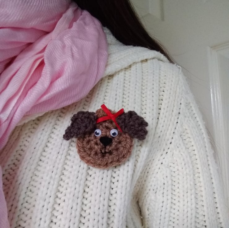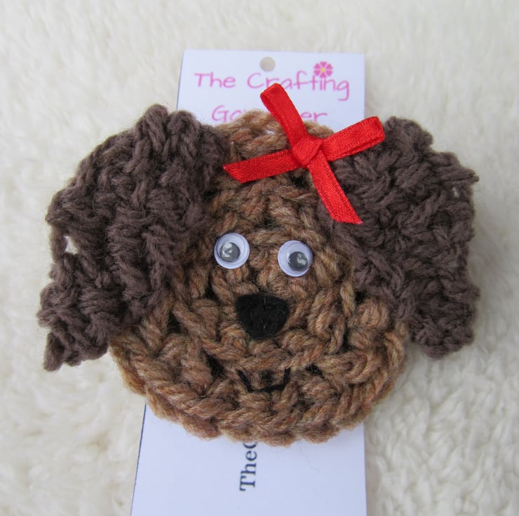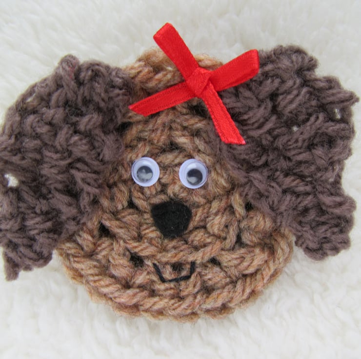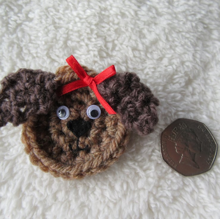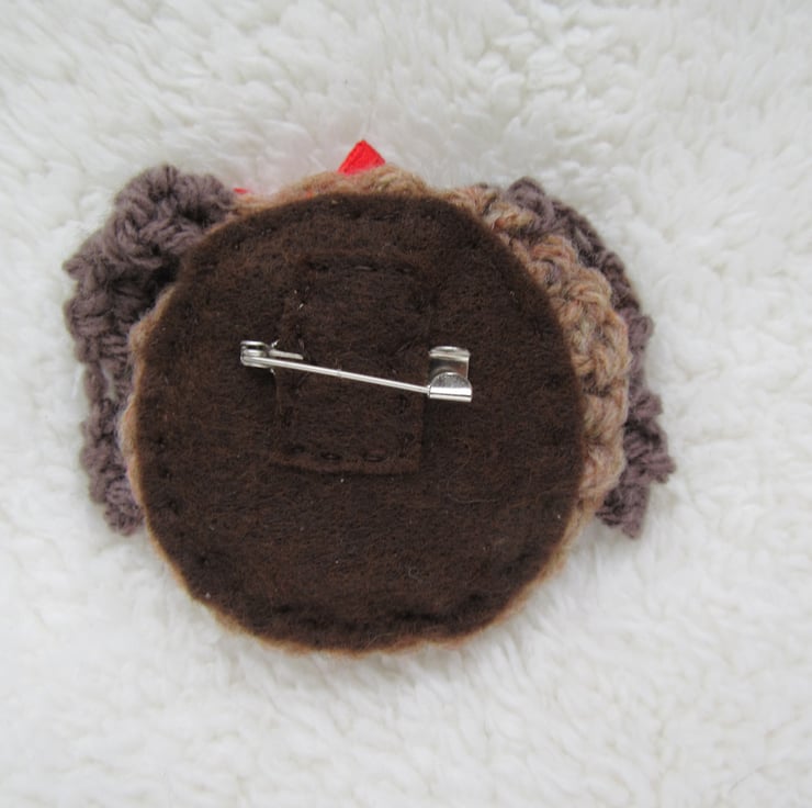 This little dog is made from brown wool, with darker brown ears, she is wearing a cute red ribbon. The metal brooch pin is sewn securely in place and backed by brown felt.