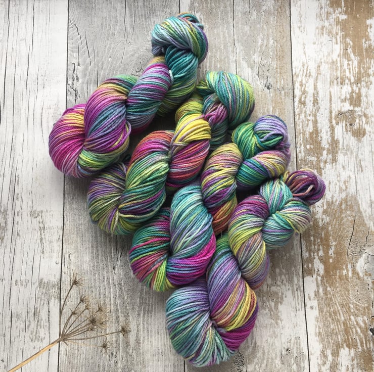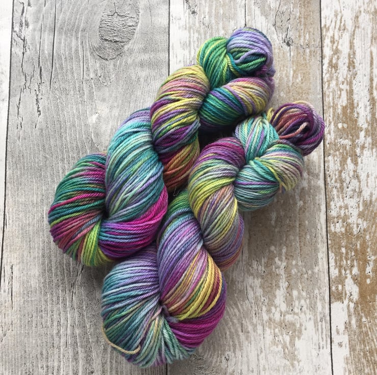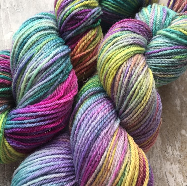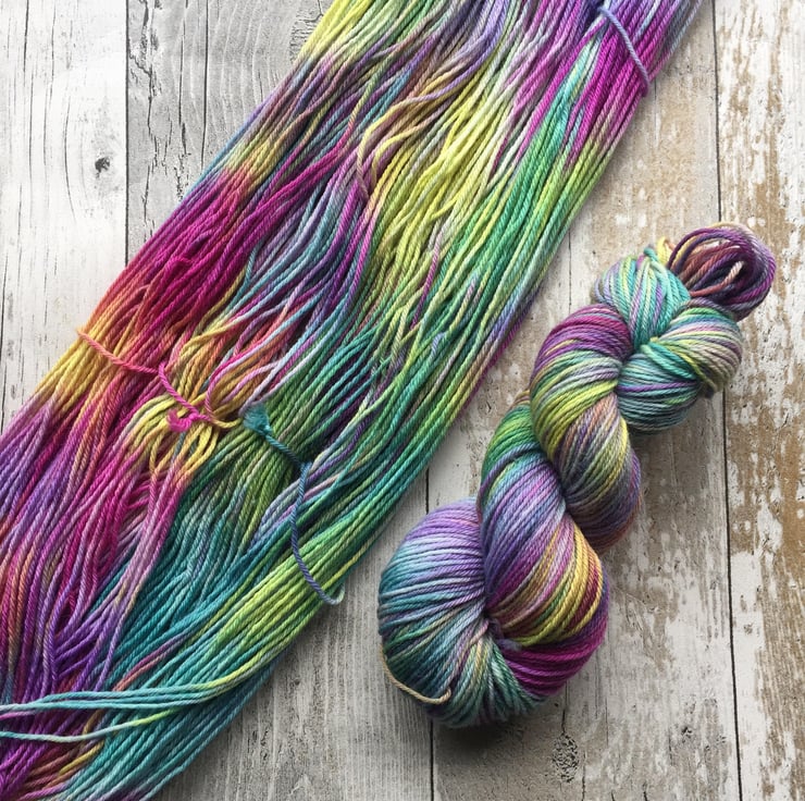 Skein of hand dyed merino yarn 75/25 nylon in my Earth song colourway.