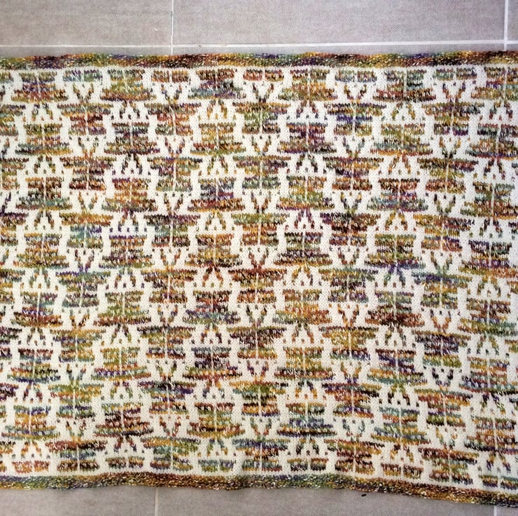 The colour work for the butterfly pattern is worked in slip stitch (mosaic work), where you work with one colour at a time, easier than fairisle knitting and a neater back to the knitting too.