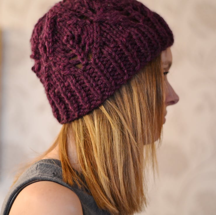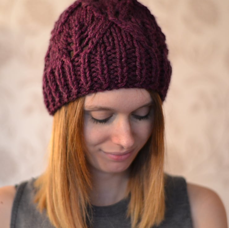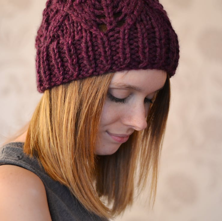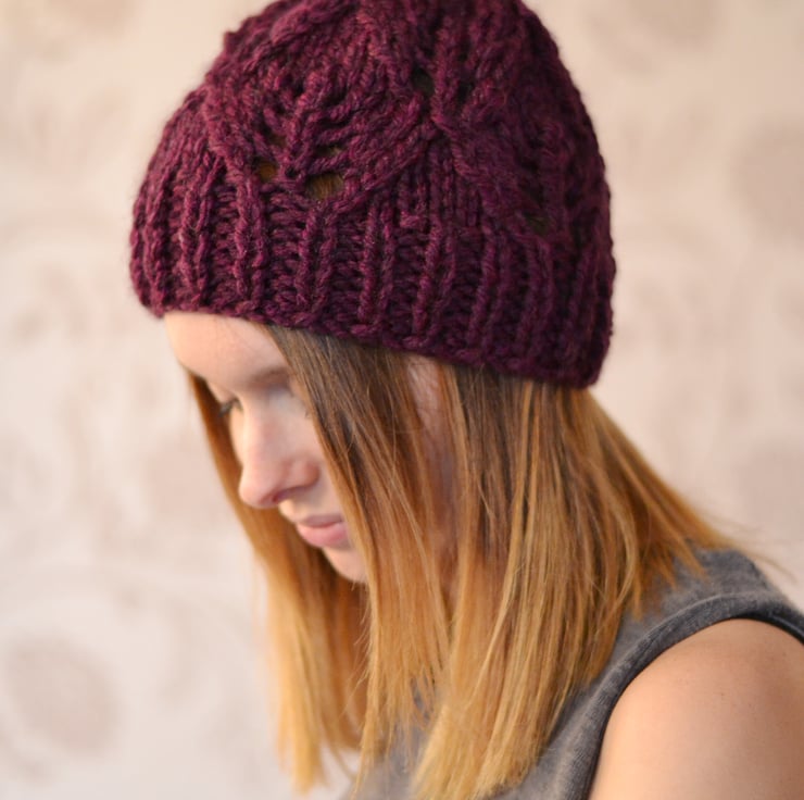 Hand knitted super chunky soft beanie hat with a diamond pattern. Very soft and so comfy to wear. The one being modelled is called redcurrant. If you would like it made in another colour tell me the number from the colour chart. Please not this item will be made once sold so please allow 10 days from ordering for it be made.