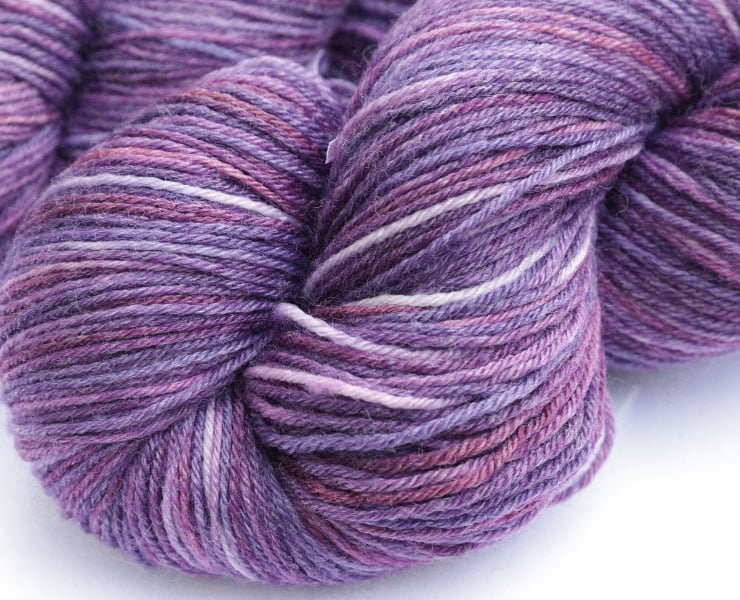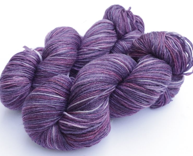 Violet, purple, magenta, lilac and lavender with some lighter sections. This is a silky-soft superwash Bluefaced Leicester and bamboo blend, with an subtle but almost shimmery sheen. Photos have been taken and edited in bright natural light. There is one skein left.