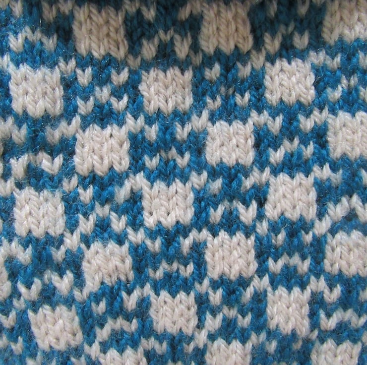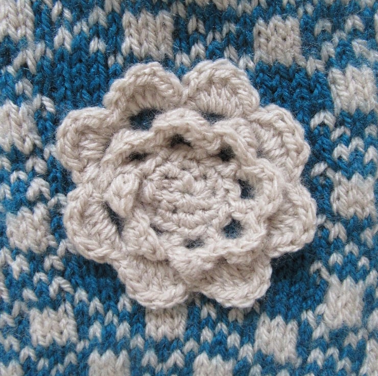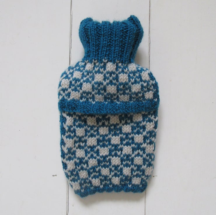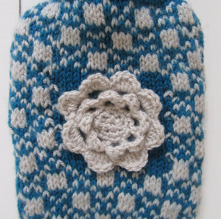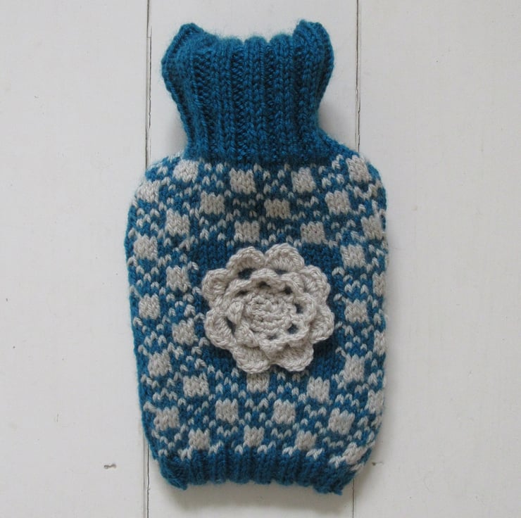 A hand knitted Scandinavian ski inspired hot water bottle cover. Knitted using a traditional Scandinavian pattern, in a deep teal blue and linen colourway. The body of the cover is knitted in the 2 colour diagonal pattern, with a deep teal blue rib around the neck and bottom for a goodly snug fit. The front has a plain deep teal blue square onto which is sewn a linen coloured crocheted flower. It has been designed with an envelope style back opening.