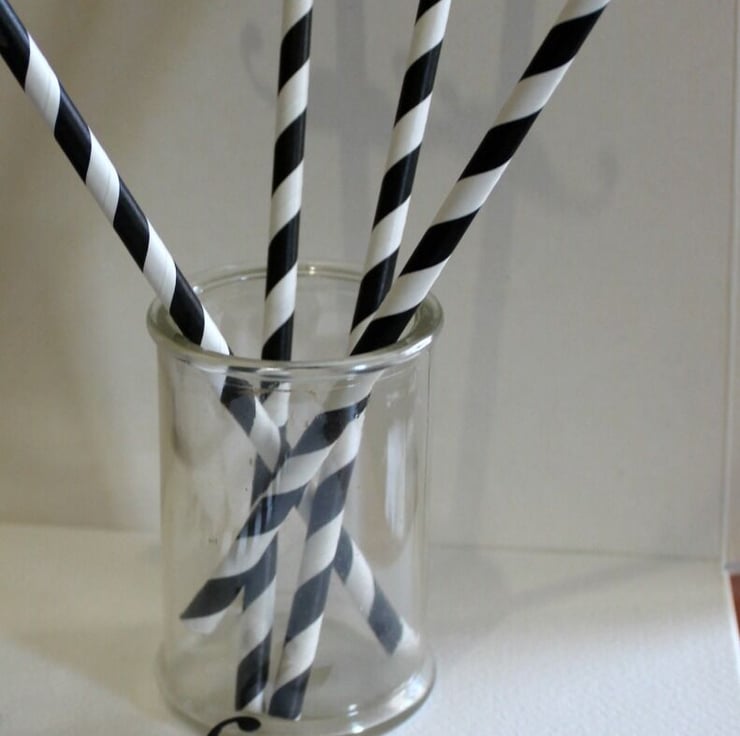 Retro Black and white striped paper straws with quirky black moustaches attached.
