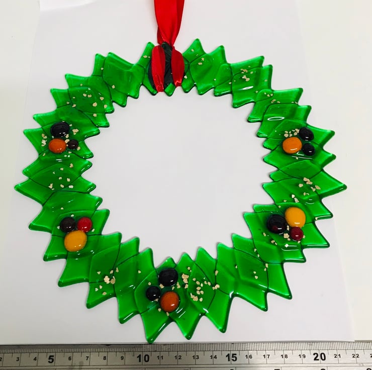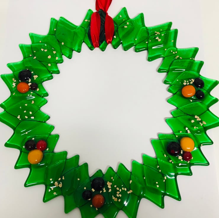 Fused glass wreath with berries. This stunning wreath is nine inches wide (approx) and would make a stunning addition to your home and is hardy to weather so can be hung against a wall inside or out . It also looks great hanging in your window . I wouldn’t recommend a door bus to the constant opening and closing . The wreath is all hand cut glass and hand made glass berries assembled carefully in my kiln for 12 hours . Once cool it’s then washed and ribbon added .