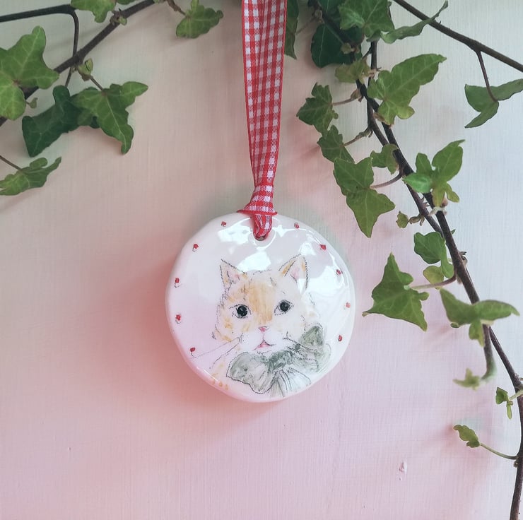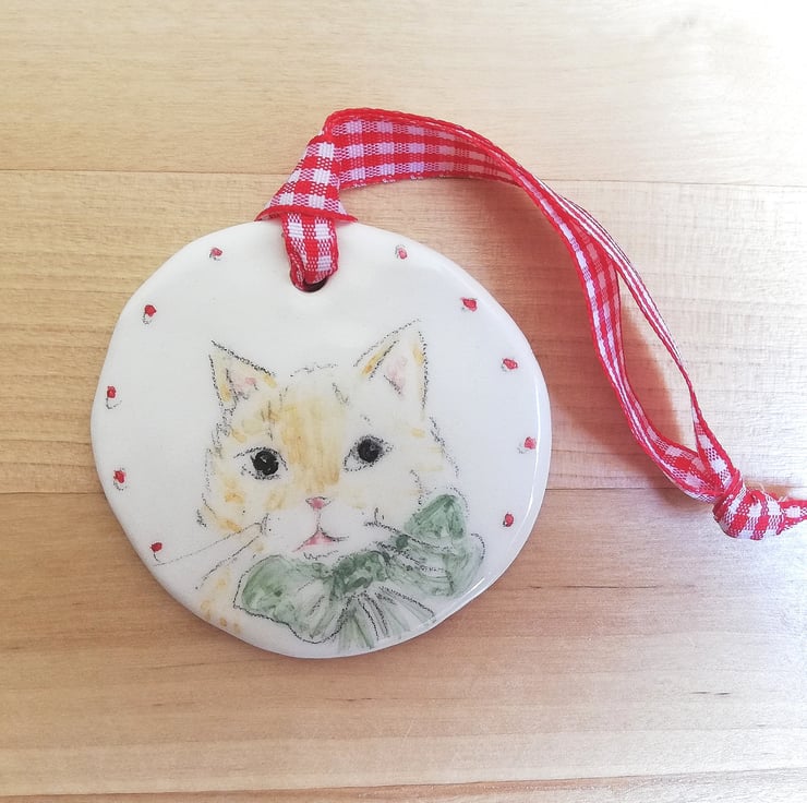 Hand made cat ornament for home or Christmas tree. Handpainted with ginger cat face and green bow.