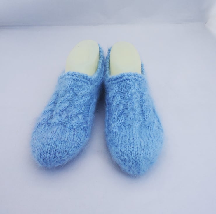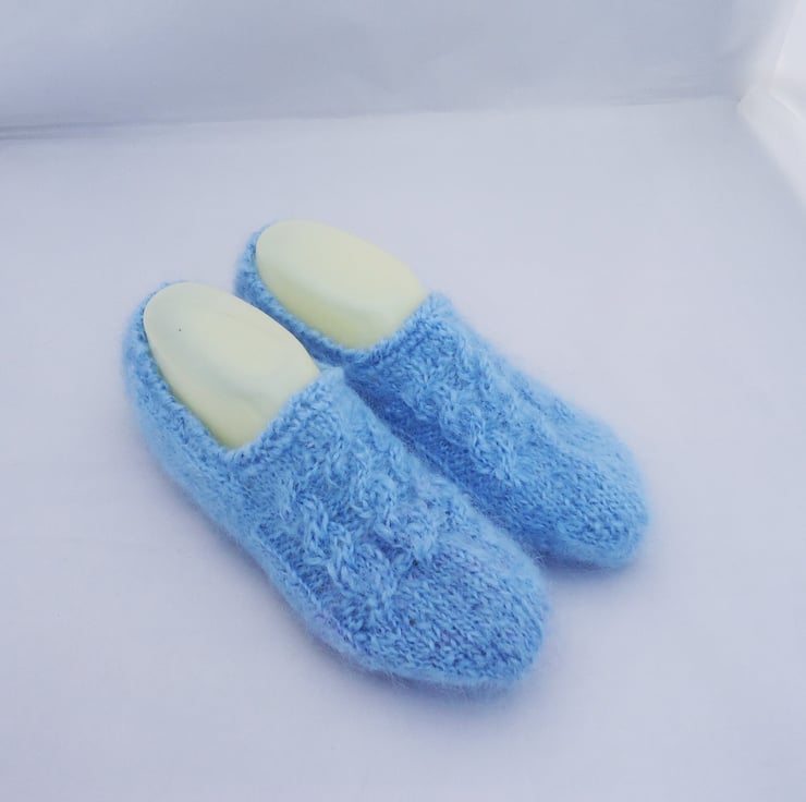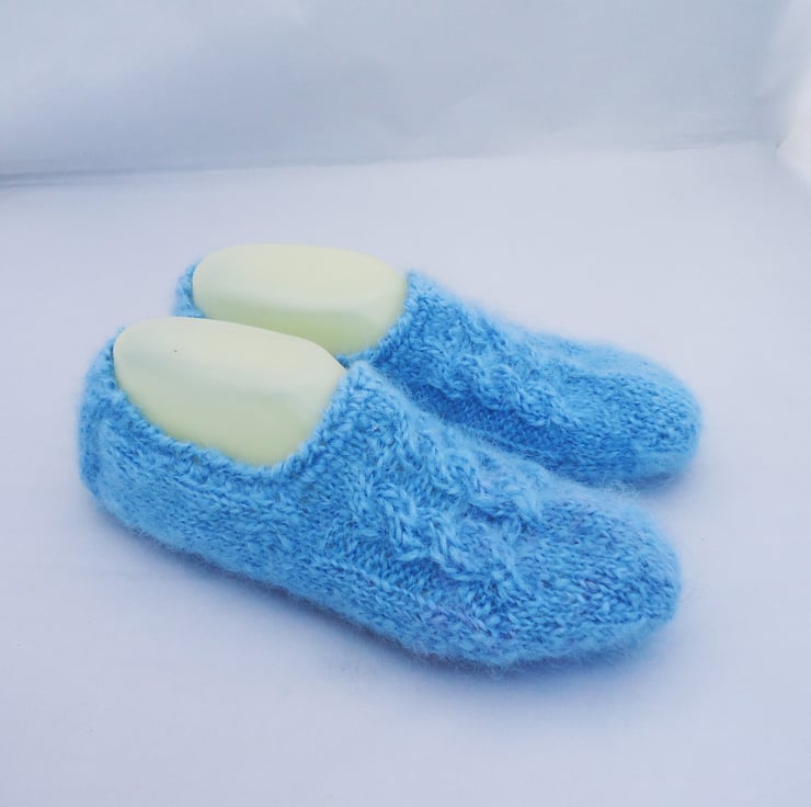Handknit Mohair Slippers, Blue Mohair Slippers, Home Socks, Indoor Slippers