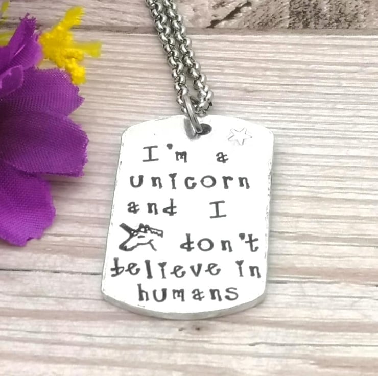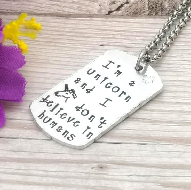 This necklace will have the wording, I'm a unicorn and I don't believe in humans.