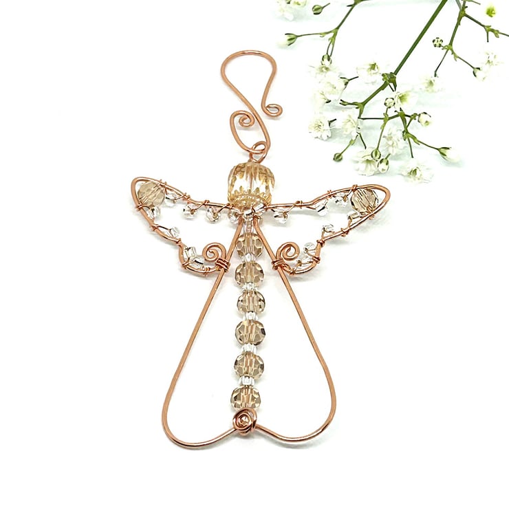 A unique copper wire Angel decoration adorned with glass pearls and crystals.