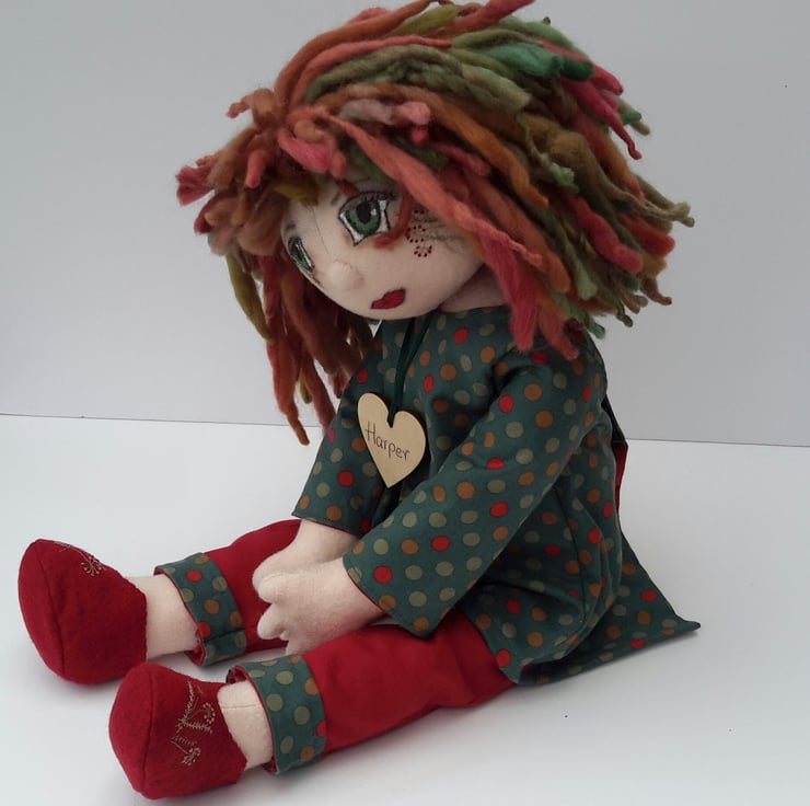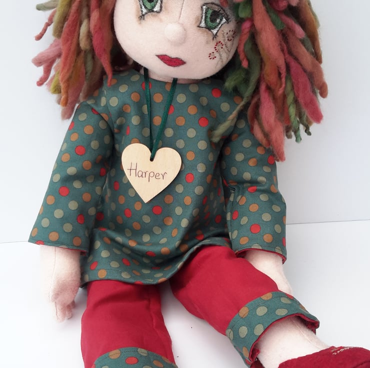 All of my dolls can be personalised with change of name, a sash, embroidered name tag or little bag, please contact me if you would like details.