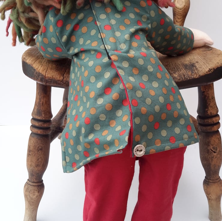 Her clothes are from beautiful medium weight quality fabrics, she wears a pair of red trousers with contrast hem and a polka dot long sleeved tunic in greens, reds and autumn shades with plain red lining throughout, fastened with velcro to the back seam.
