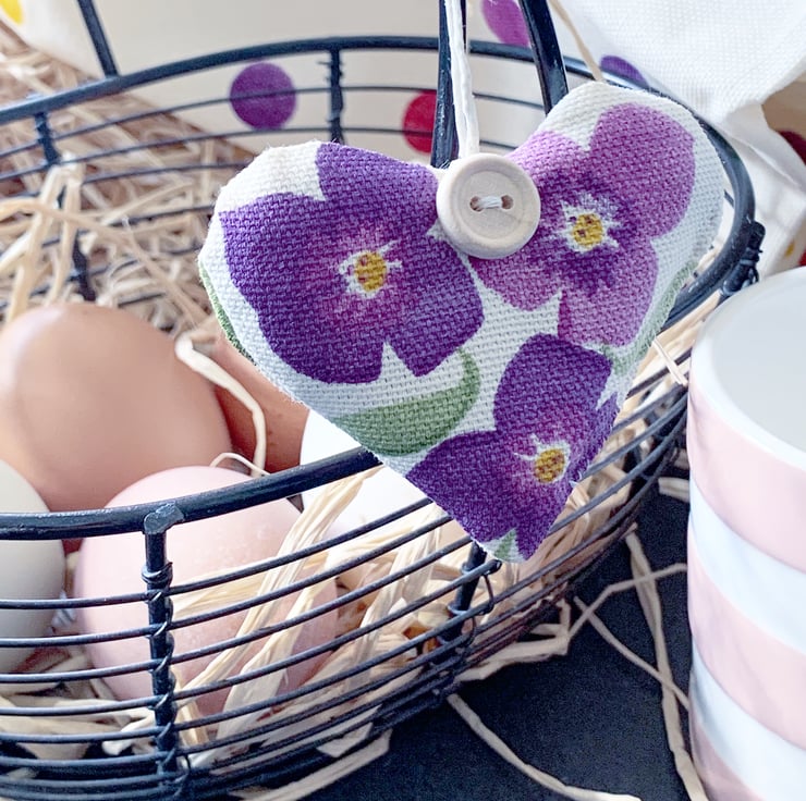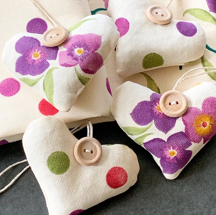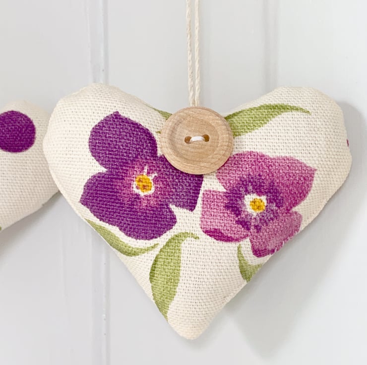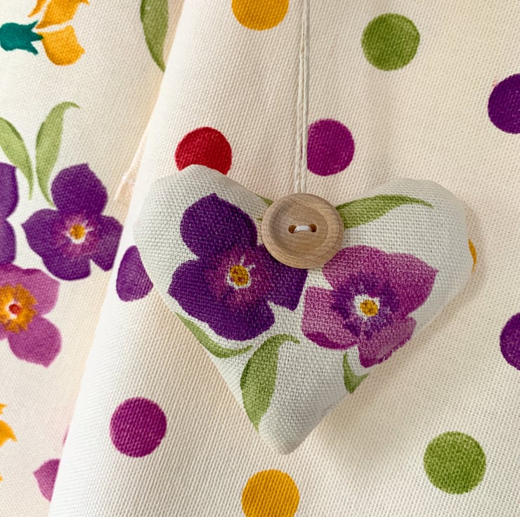 In Emma Bridgewater's beautiful 'wallflower' fabric, this heart is generously filled with fragrant locally grown Hampshire lavender and is hand-finished with a rustic wooden button and natural hemp twine.