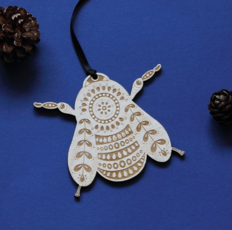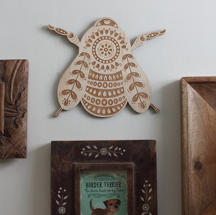 This large bumblebee is intricately etched with a floral folk art style pattern, and will sit proudly on any wall or shelf.