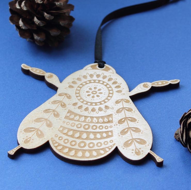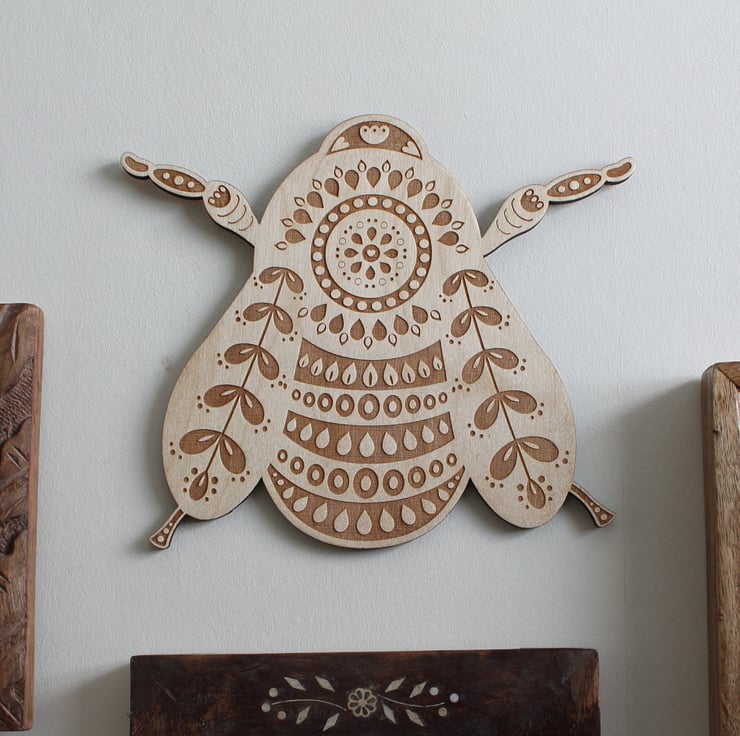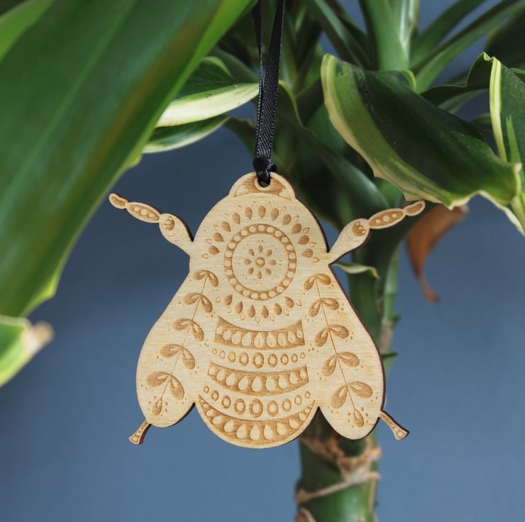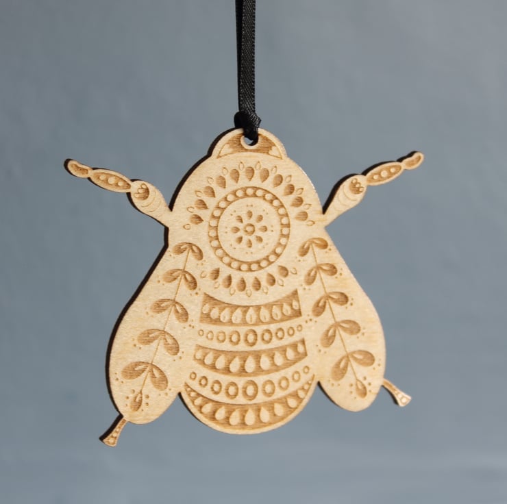 A smaller version of our large wall bee, but just as lovely. He's etched with a detailed folk art style floral pattern and hangs from black ribbon.