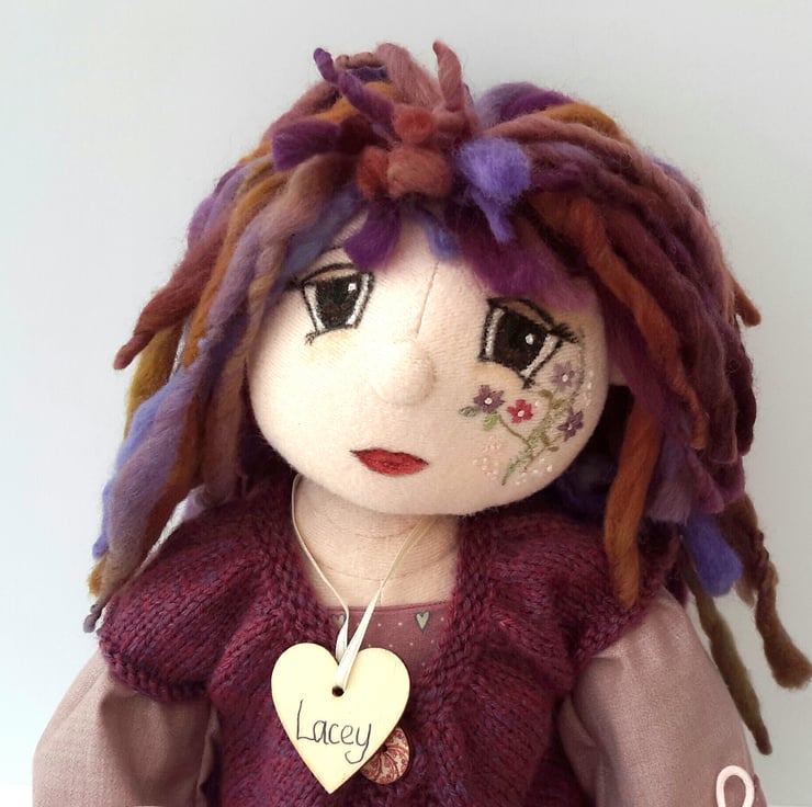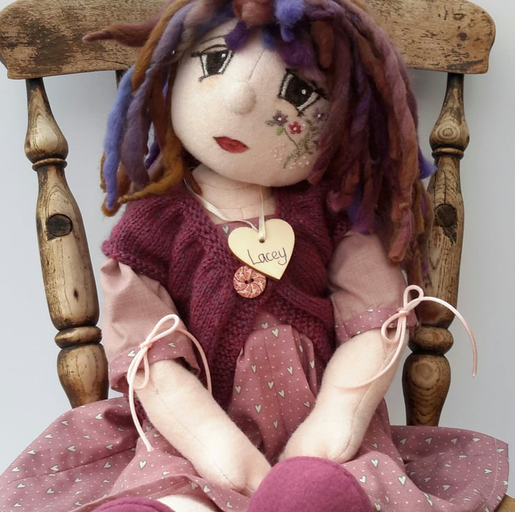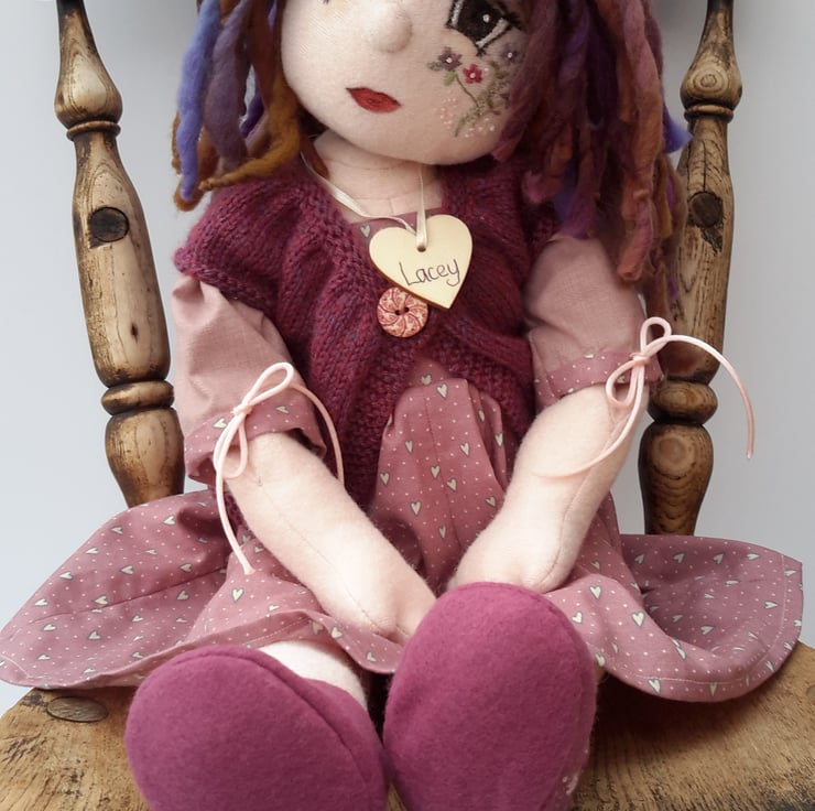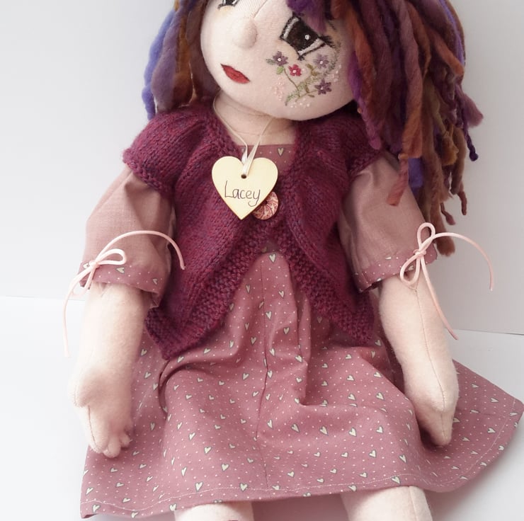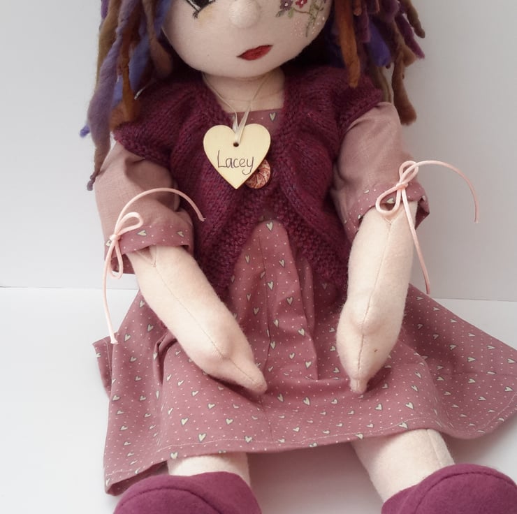 This is Lacey, a large 55cm 22" pretty, collectable, keepsake rag doll with a beautiful hand painted face, hand embroidery and quality clothing.