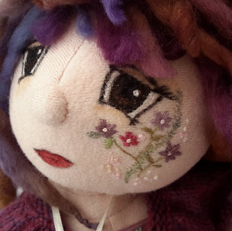 Lacey's face was meticulously hand painted with both acrylic and fabric paints. I have also hand embroidered delicate flowers to one side of her face.