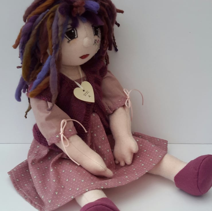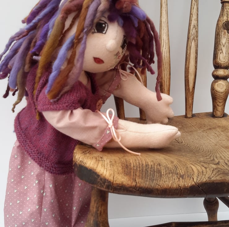 Her hair is bright and funky, each strand individually sewn in place from 75g of hand dyed and hand spun merino yarn in purples, deep pinks and rust colours.
