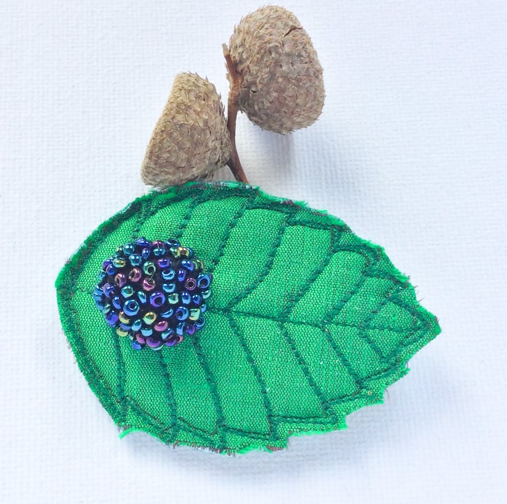 Each bramble leaf brooch has been made using a small piece of silk fabric. I have used freemotion embroidery to pick out the details of the leaf veins and a colourful seed bead blackberry sits on top. This would make a lovely accessory for a chunky scarf or jacket.