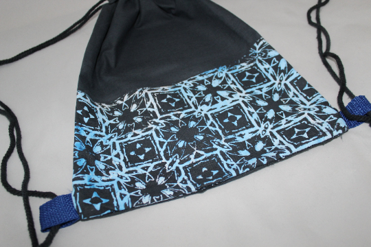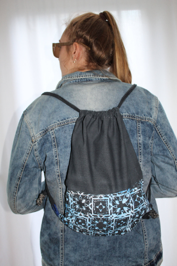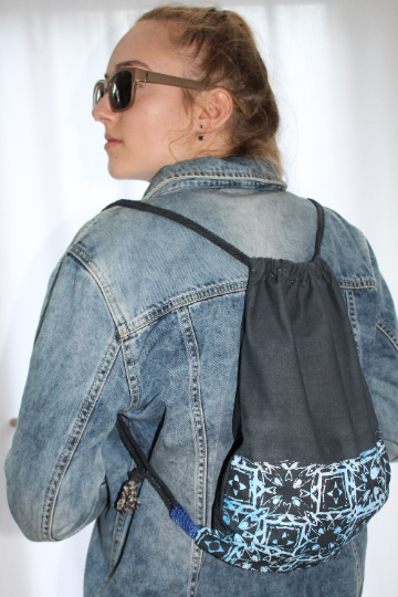 Handmade with love drawstring bag/ lightweight backpack, hand screen printed with my new geometric print which was derived from my own hand drawn design. Printed in a range of blue hues to create the stripy effect throughout the print.