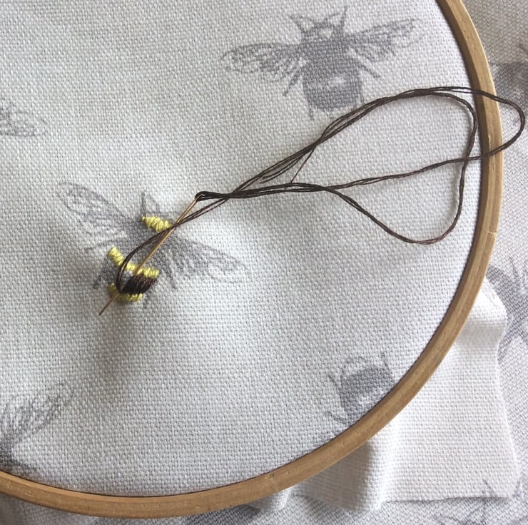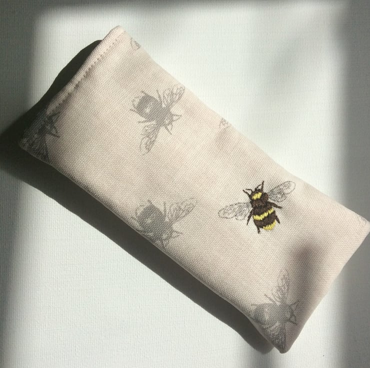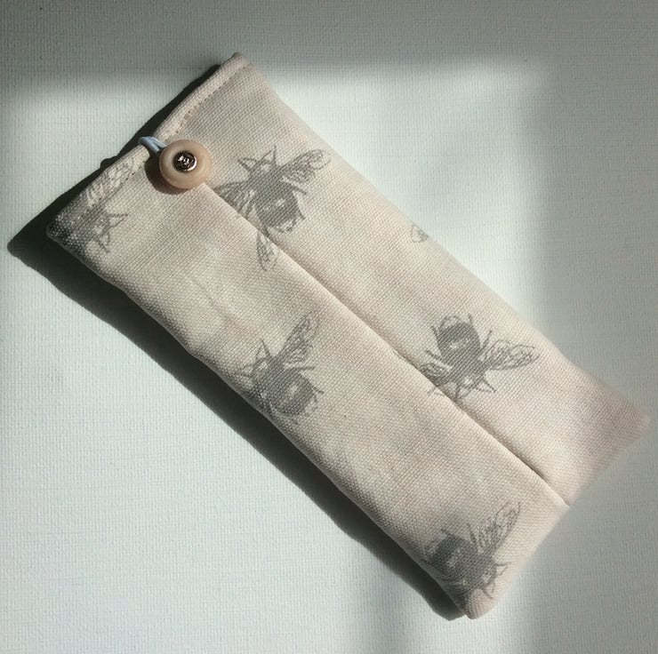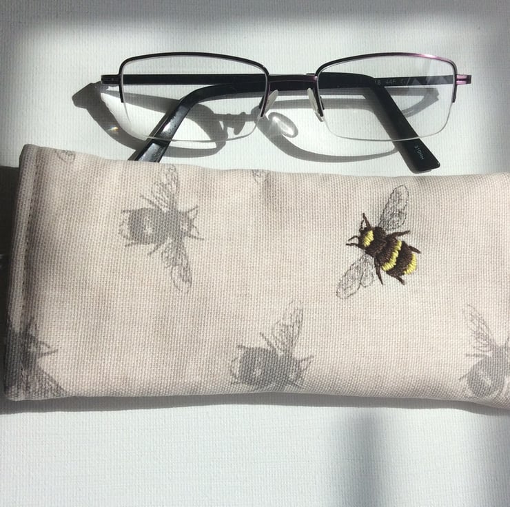 This glasses, sunglasses case is made from an attractive, woven, cotton fabric with a beige background and grey bees. I have hand embroidered one of the bees using yellow and brown embroidery silks with silver thread for the wings.The case is lightly padded and lined with a beige and cream checked cotton. The case measures approximately 17.5cm x 8cm. There is a button and white, elastic loop closure.