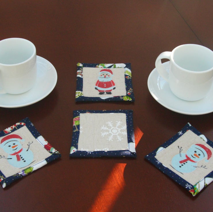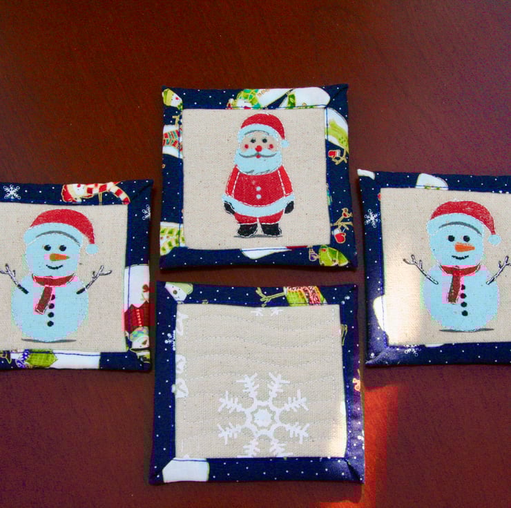 This set of four quilted coasters has a jolly Santa, cheeky Snowmen, and festive Snowflake designs, perfect for adding some Christmas cheer to your drinks!