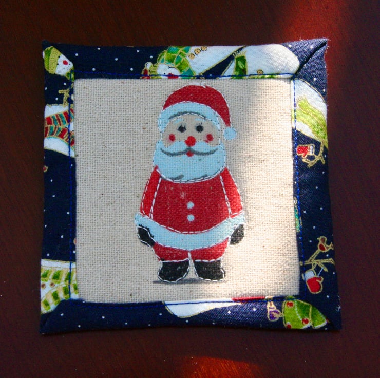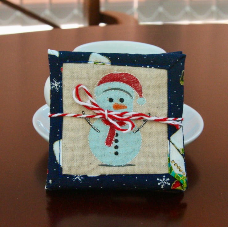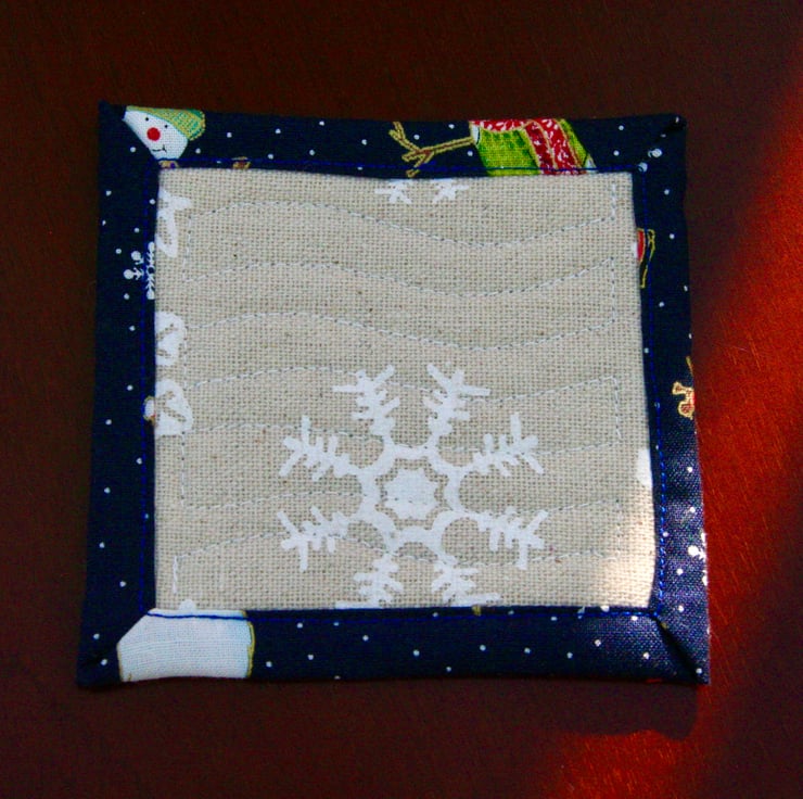 I saw the Hessian material in my local Quilting and Patchwork shop in Romsey and couldn't resist the lovely Snowmen and Santas! I loved making them into these fun coasters.