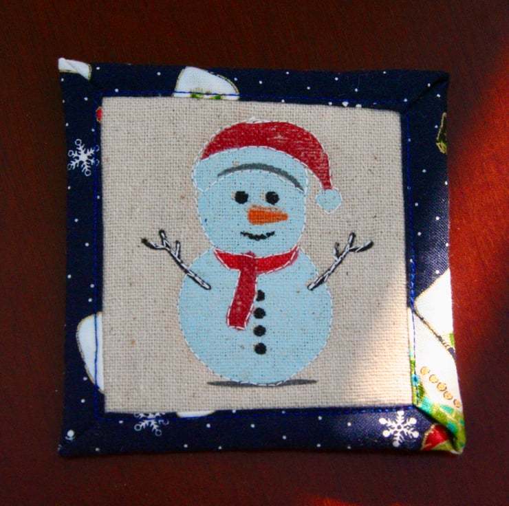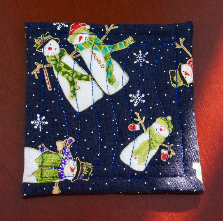 The main material is a printed hessian with 4 different designs to add variety. The high quality cotton backing material, with happy Snowmen, is also used to bind the edges. Finally they have a polyester/cotton blend wadding in the centre. The items are all machine quilted with free-motion quilting. For the Snowman and Santa I have traced the characters with the quilting in order to highlight the design.