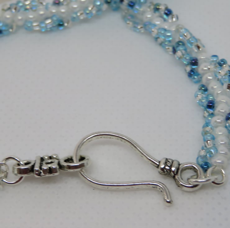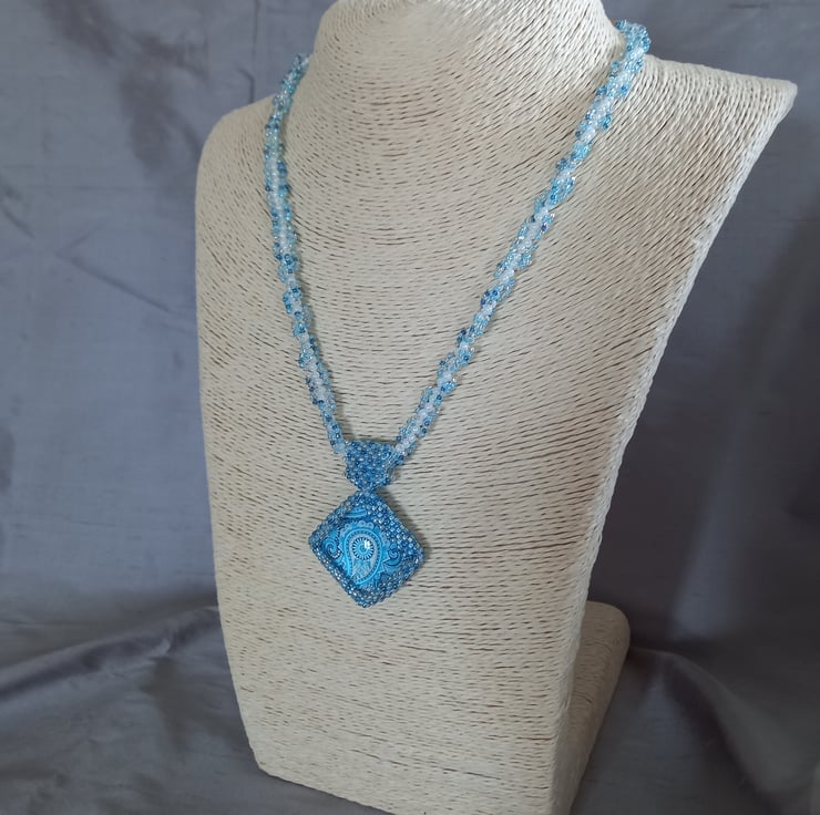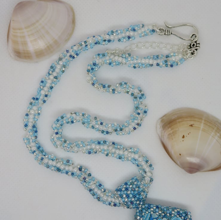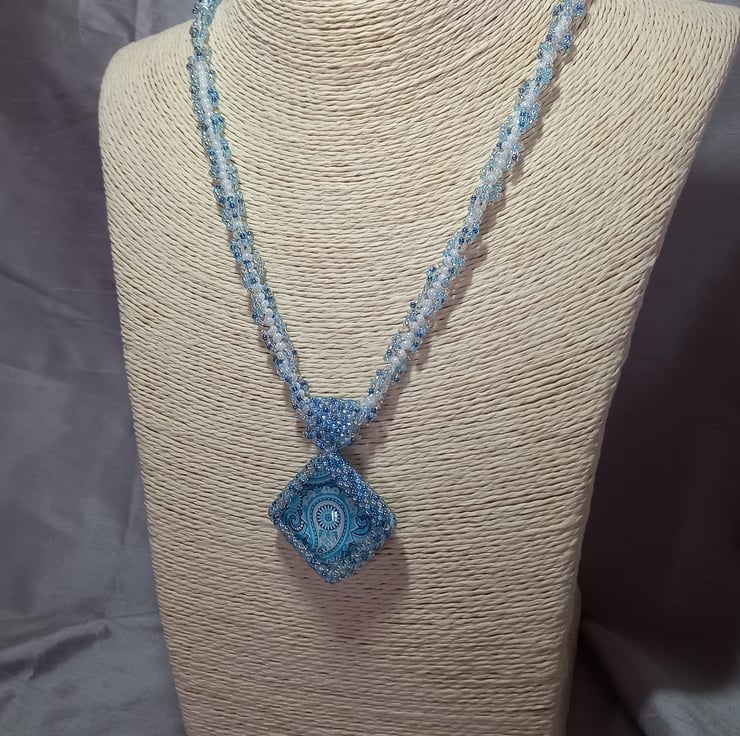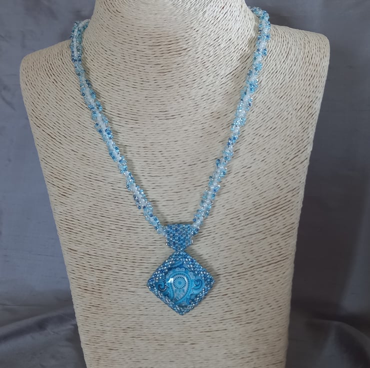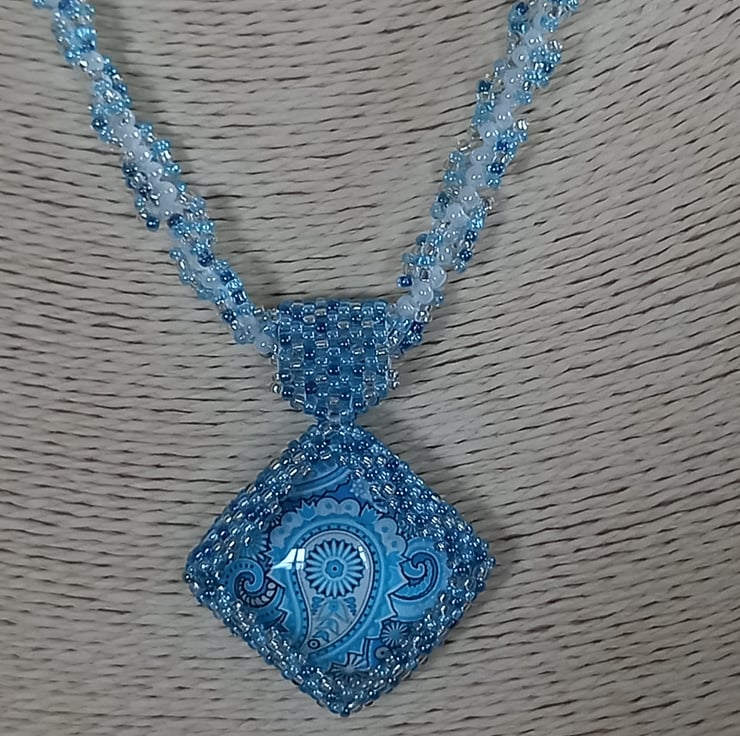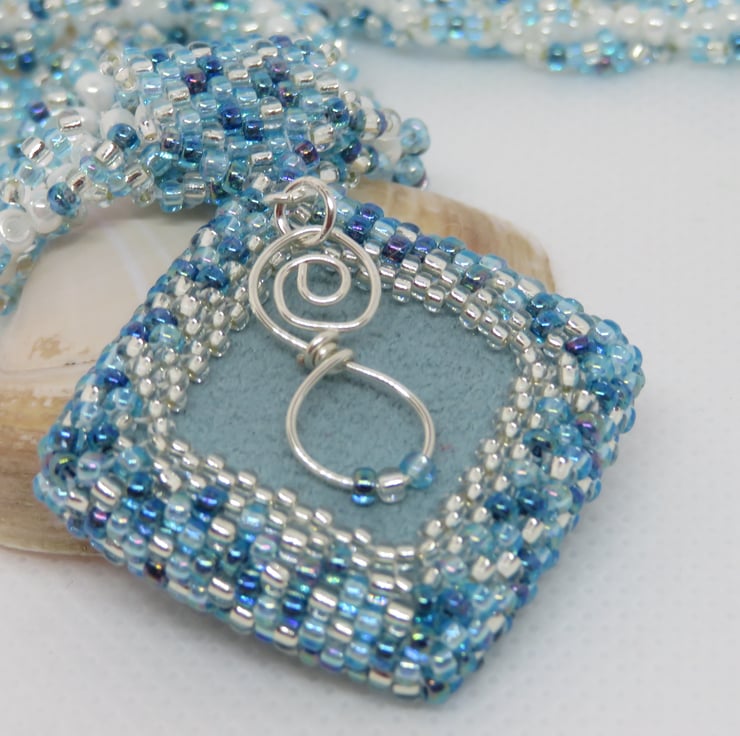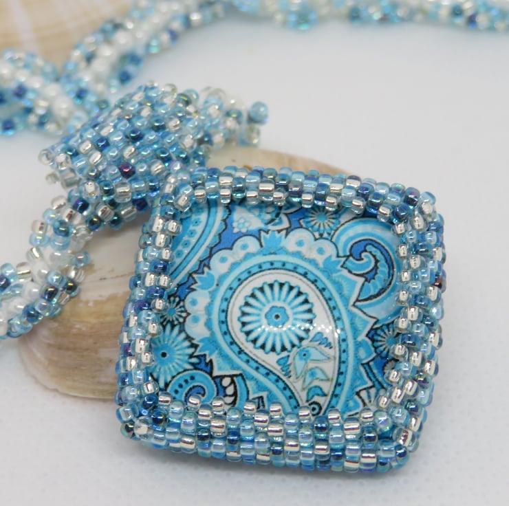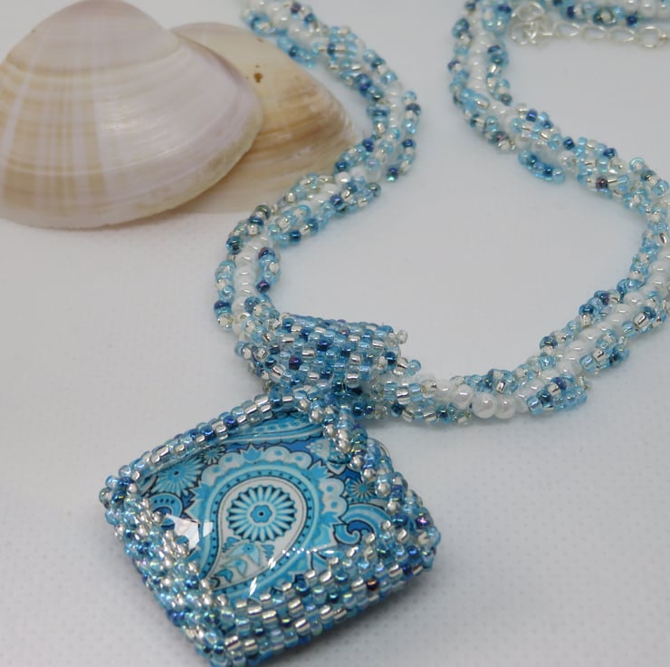 This pretty piece starts with a turquoise paisley glass cabochon. The design has been printed onto paper and covered with a clear glass cabochon, then I have beaded around it using peyote stitch in co-ordinating turquoise shades of miyuki seed beads. The cabochon is backed with Ultrasuede and my spiral symbol is attached at the back - you could even wear the pendant the other way around with the symbol showing for a bit of variety. The hand beaded spiral rope that comes with this piece can be worn on its own, just by slipping it out of the bail. The necklace fastens with a simple Tibetan silver hook and an extension chain is attached if you need some extra length. This is a really versatile piece - great for special occasions and great for everything else in between.