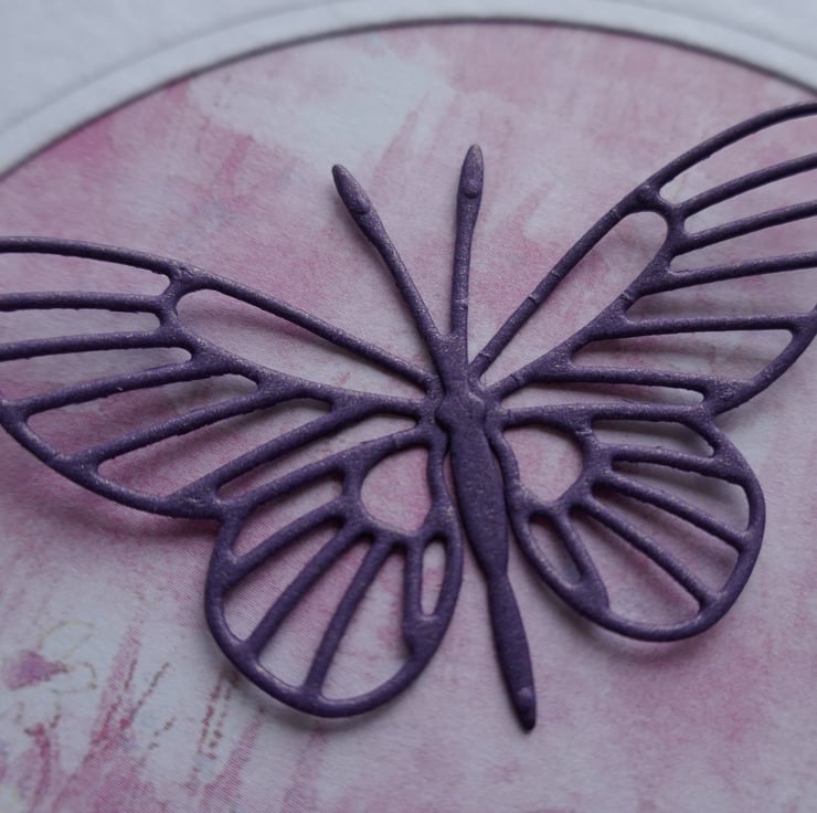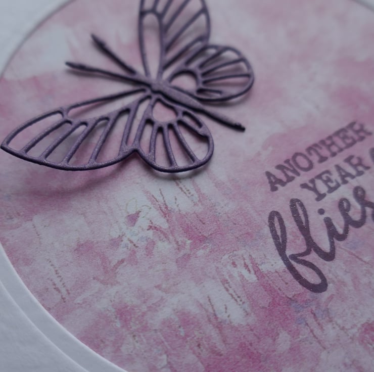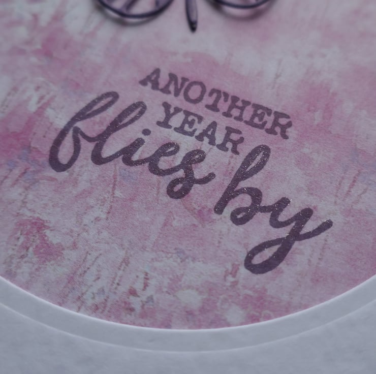 The card measures approximately 6" x 6" and is made from white hammer card. The front panel is slightly smaller than the card front and has a die cut circle in the centre, behind which is a piece of pink patterned paper. The sentiment 'Another Year Flies By' is stamped onto the paper in a purple ink and highlighted with a hint of sparkle. The butterfly has been die cut from purple pearlescent card and attached along the body so the wings can be shaped. As these cards are handmade they are all slightly different.