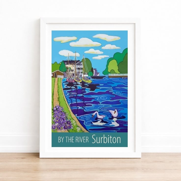 A contemporary travel poster style print of the Thames riverside in Surbiton, Surrey, from my own original acrylic painting. A perfect gift for those who love Surbiton!