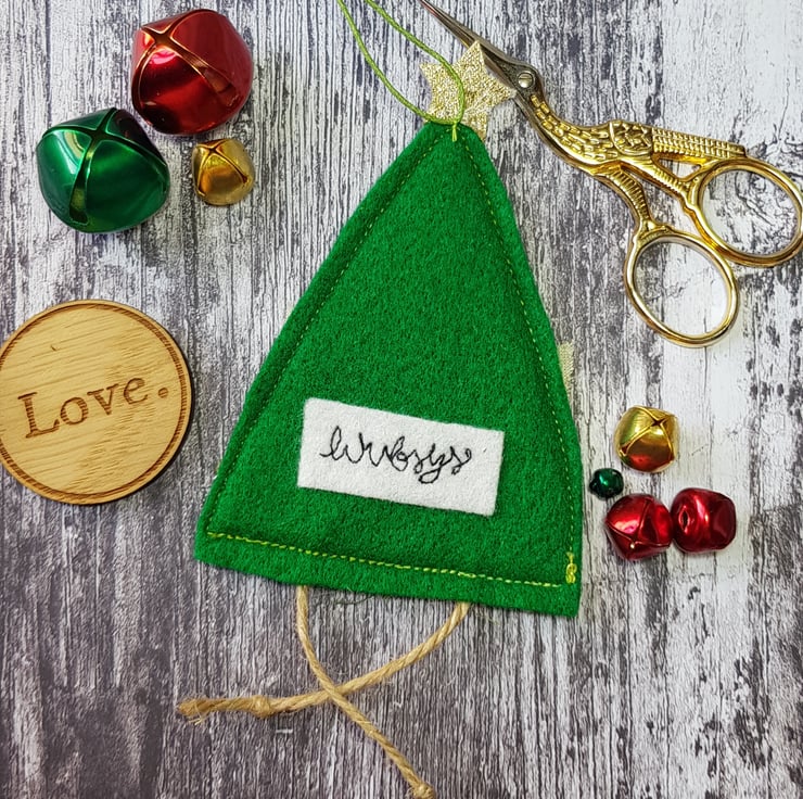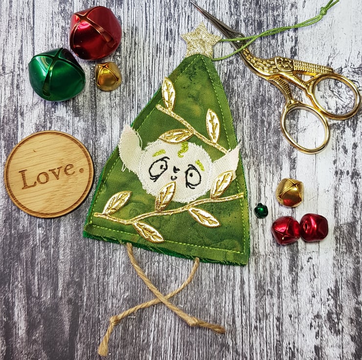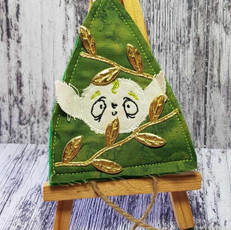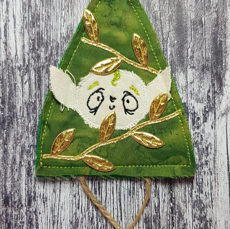 This little elf has a free motion embroidered face with waxed rosy cheeks and pointy ears. He has dangly twine legs with knotted ankles and is backed with felt and embroidered label. The elf trees is decorated with metallic gold leaf trim and can be hung by his wax thread hanger. Each one is unique and my own design, topped with a sparkly star.