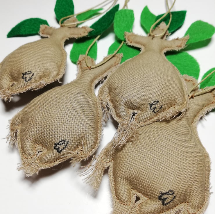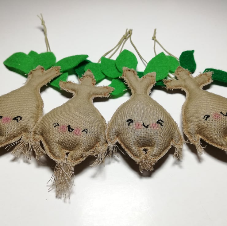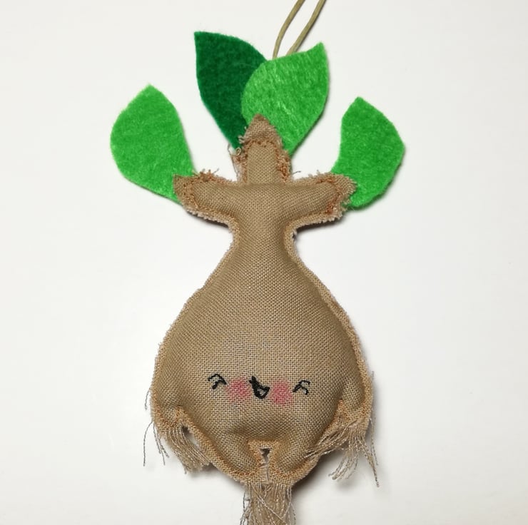 These sweet little Mandrakes are bursting with green eco felt leaves. Their cute faces are machine embroidered with wax rosy cheeks and their arms and legs end in scraggly thread roots. They have raw edging and a wax thread hanger. This listing is for one mandrake, the last mandrake left is in the third photo. This is not a toy and for decorative purposes only. Spot clean only.