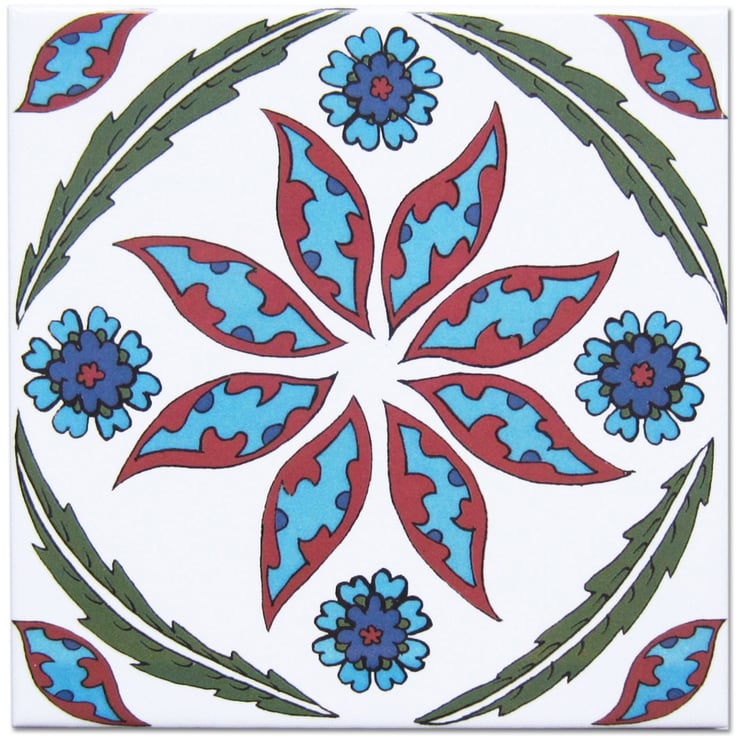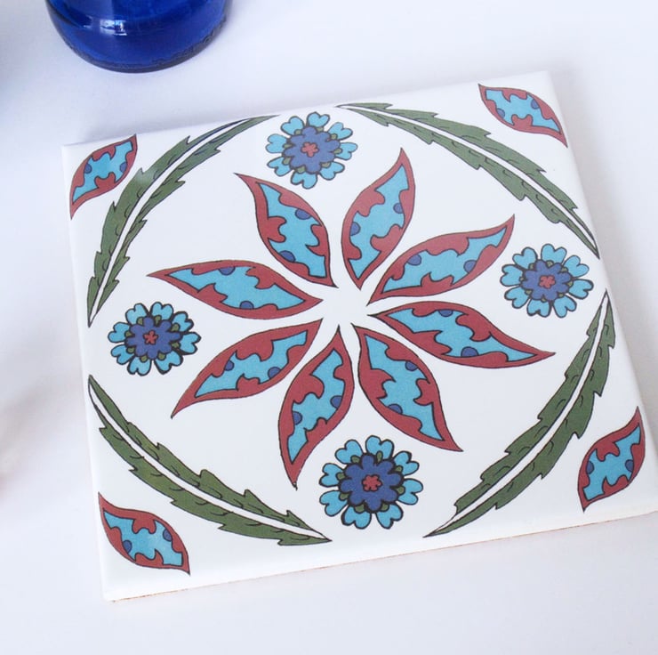 Ottoman Inspired Flower Pattern Ceramic Tile Trivet with Cork Backing