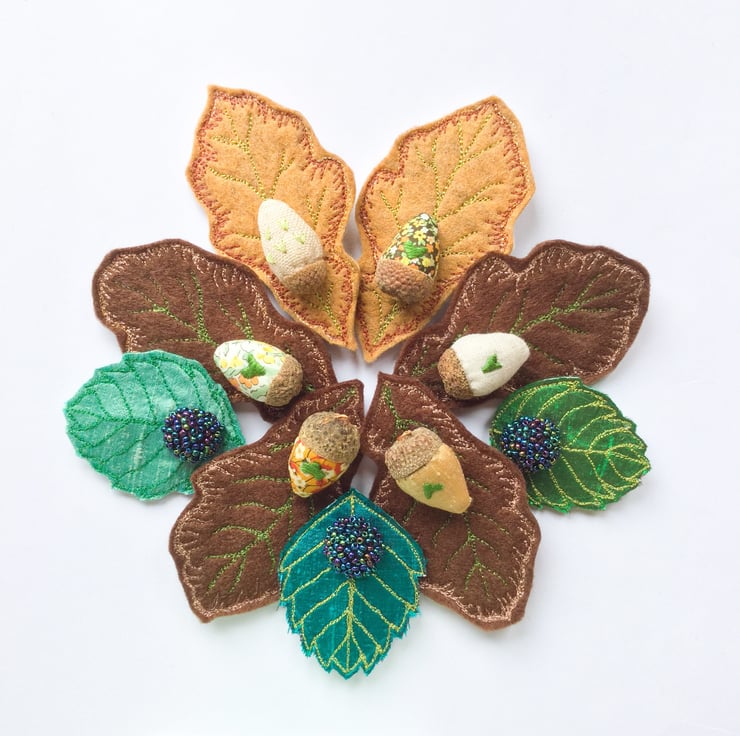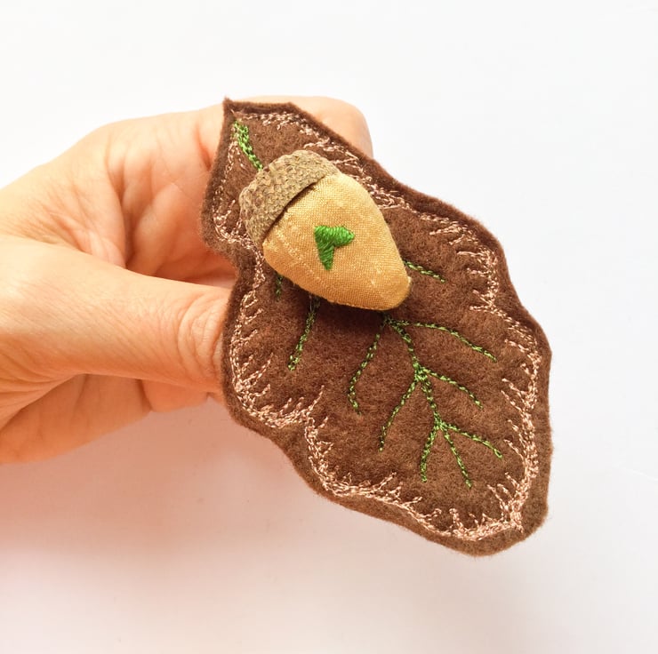 This design has been made using a combination of felt and freemotion embroidery. An English acorn cap and a tiny piece of gold silk fabric for the acorn with hand embroidery complements this lovely design. Each of my leaf brooches are unique due to the nature of their designs. Any one of these leaves would be beautiful on a chunky jumper or scarf.