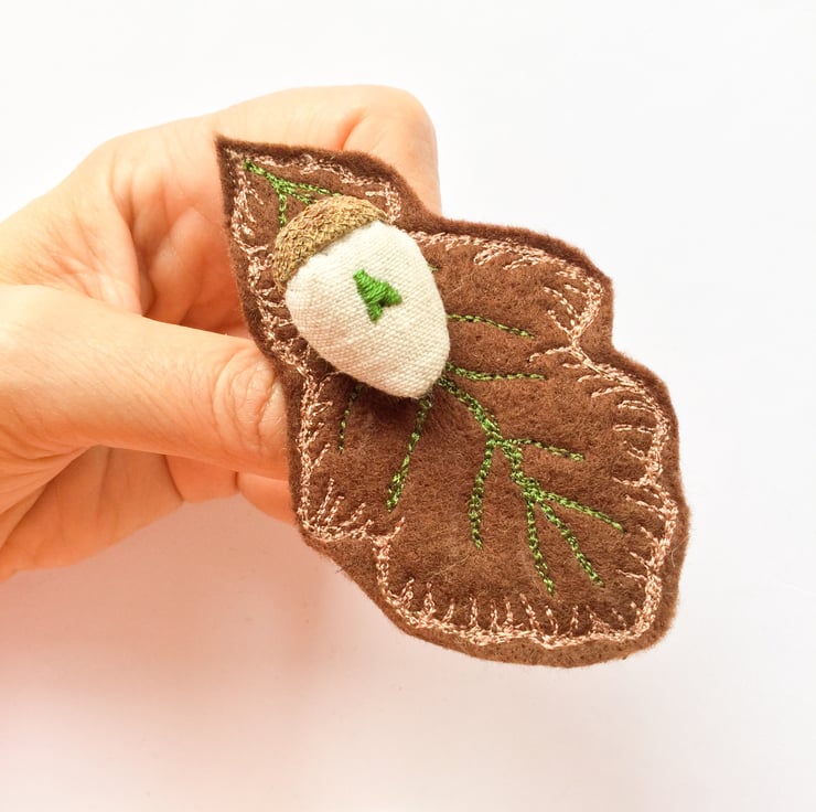 This design has been made using a combination of felt and freemotion embroidery. An English acorn cap and a linen fabric acorn with hand embroidery complements this lovely design. Each of my leaf brooches are unique due to the nature of their designs. Any one of these leaves would be beautiful on a chunky jumper or scarf.