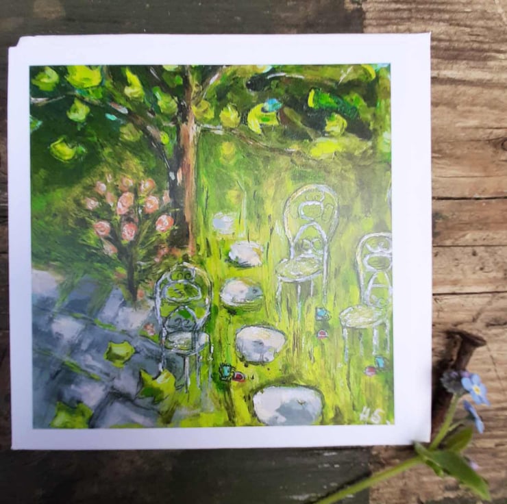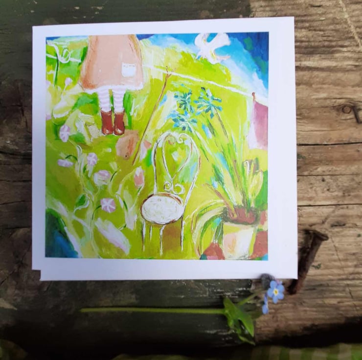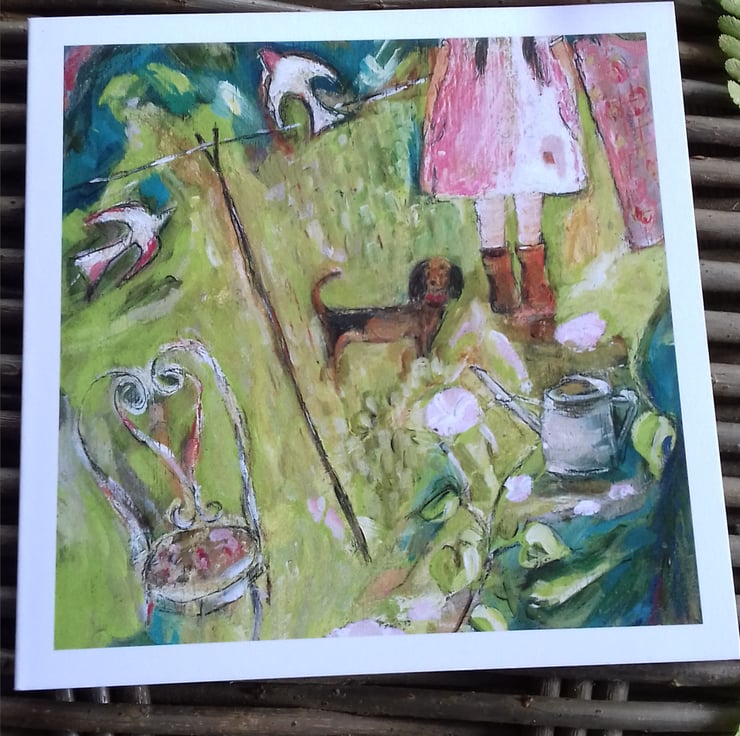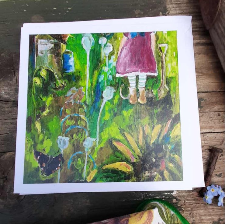 Limited run of art cards four cards in a box.four designs. blank inside .comes with envelope and paper bag and boxed but no plastic sleeve. Taken from my original paintings .hope you love them names of paintings 'Marjories garden ' 'Angelicas garden' 'Allotment days' and 'A girls best friend'