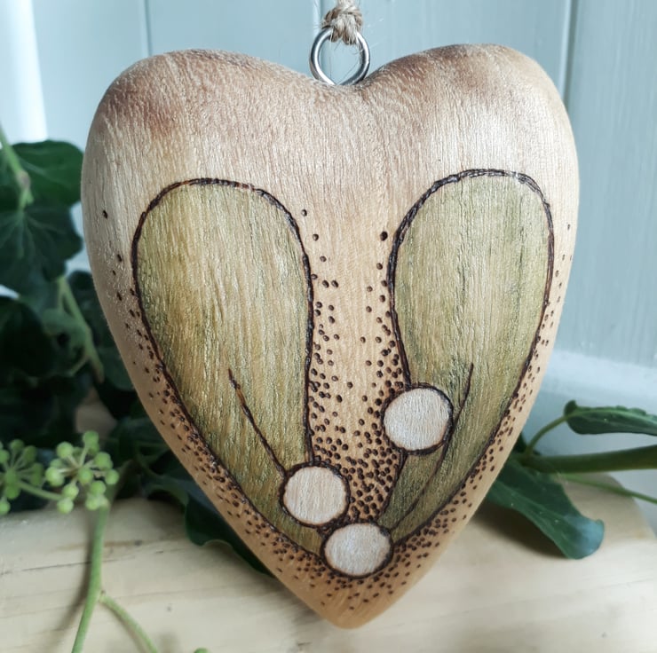 Wooden heart illustrated with mistletoe using pyrography (wood burning).