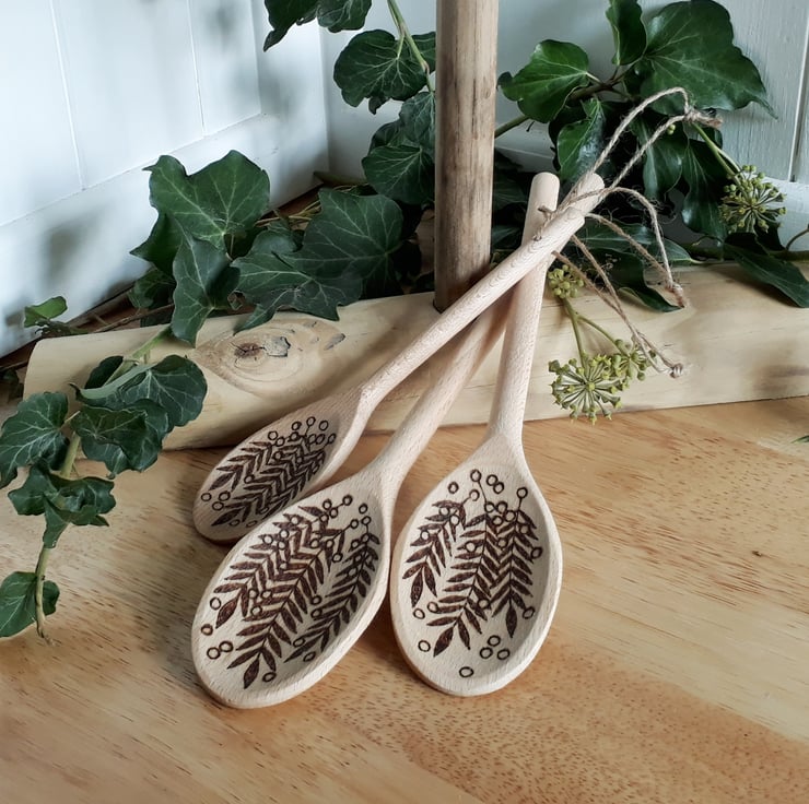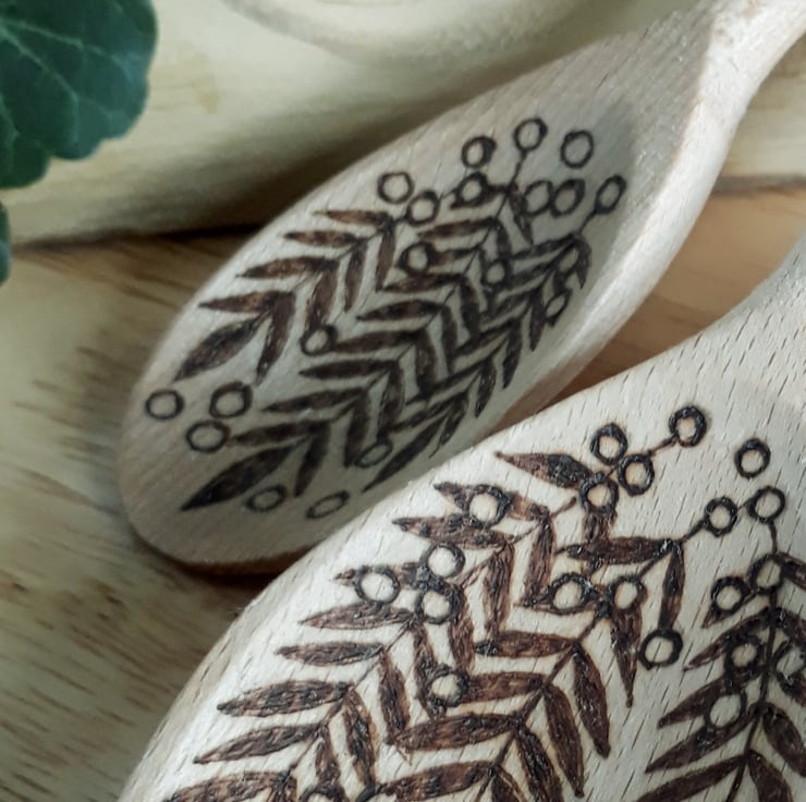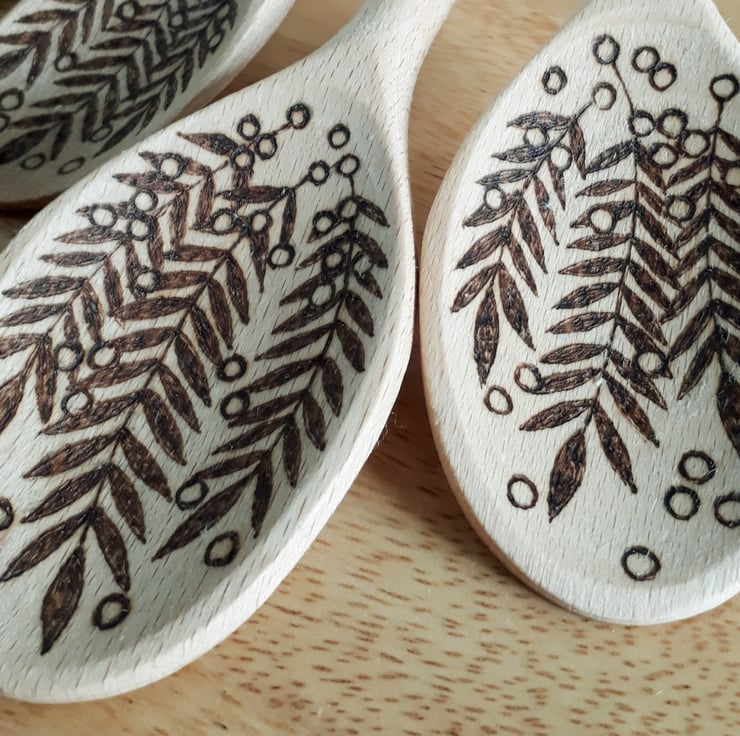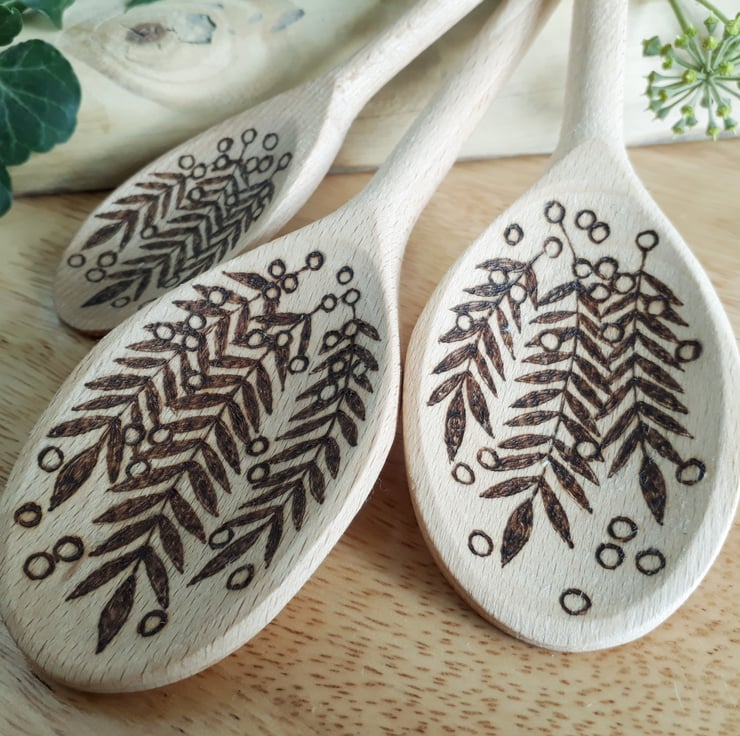 Three wooden spoons illustrated with rowan berries & leaves using pyrography (wood burning).