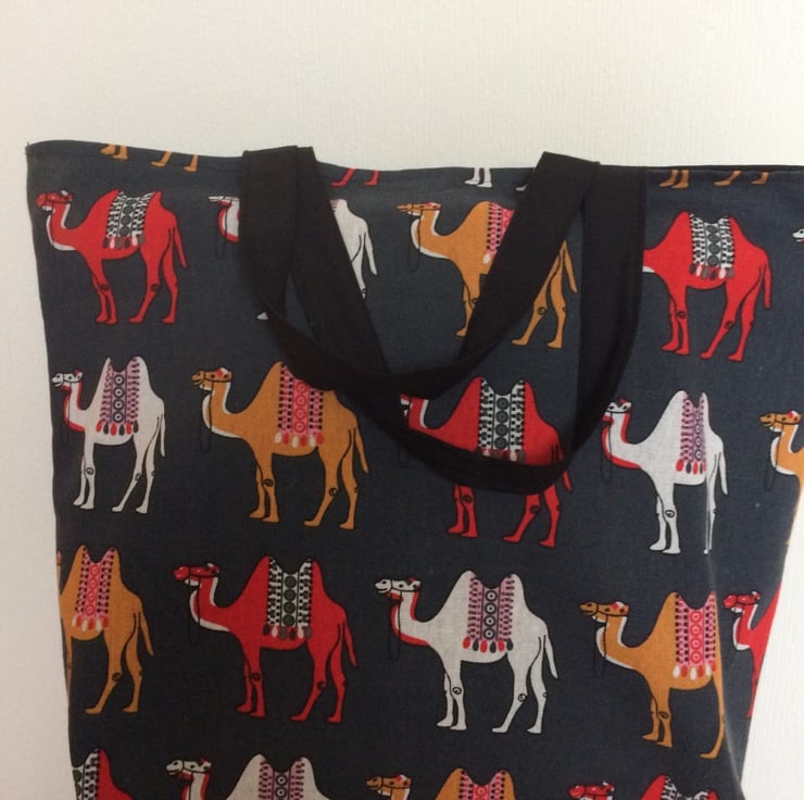 This lovely tote bag with Camel s in a cotton canvas print fully lined in a plain black cotton fabric the print its self is set on a charcoal grey colored background.