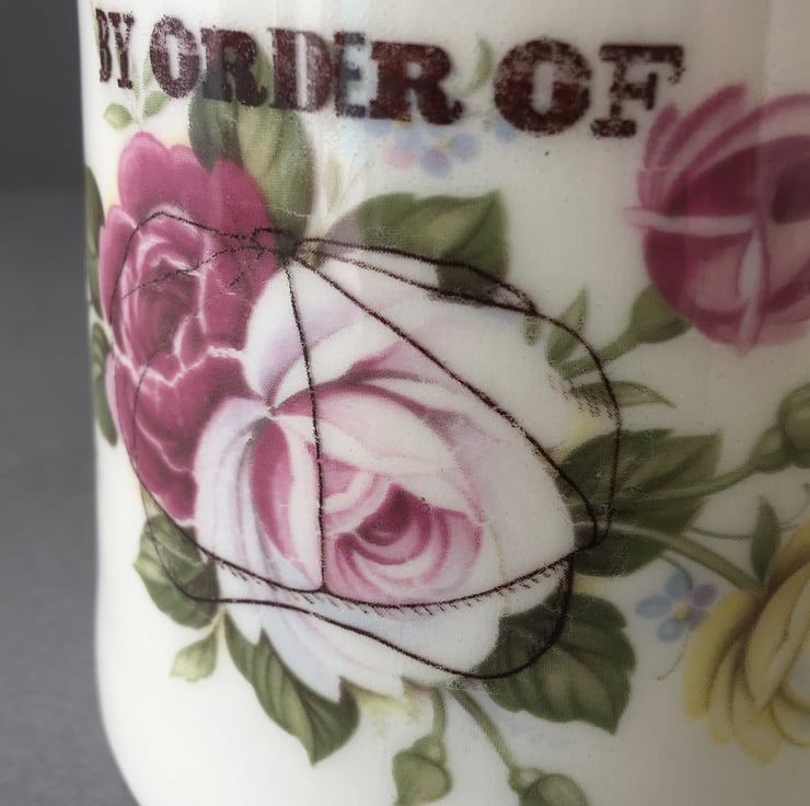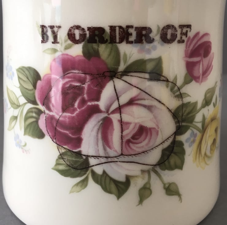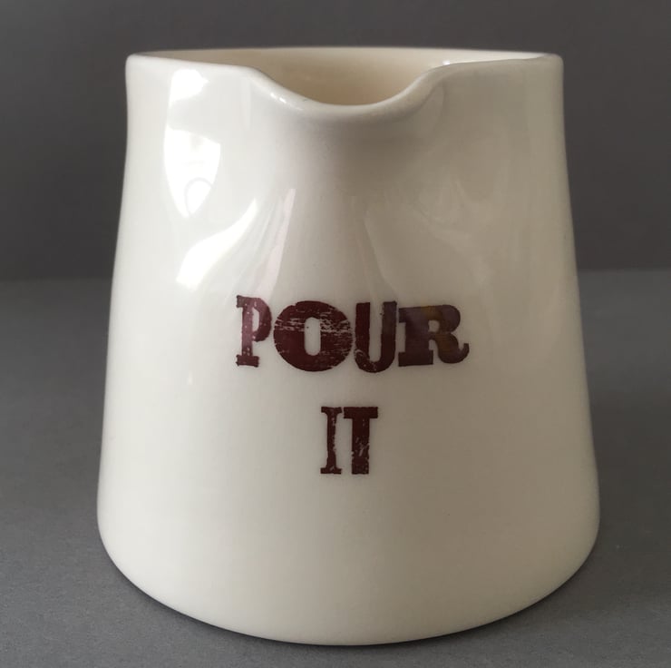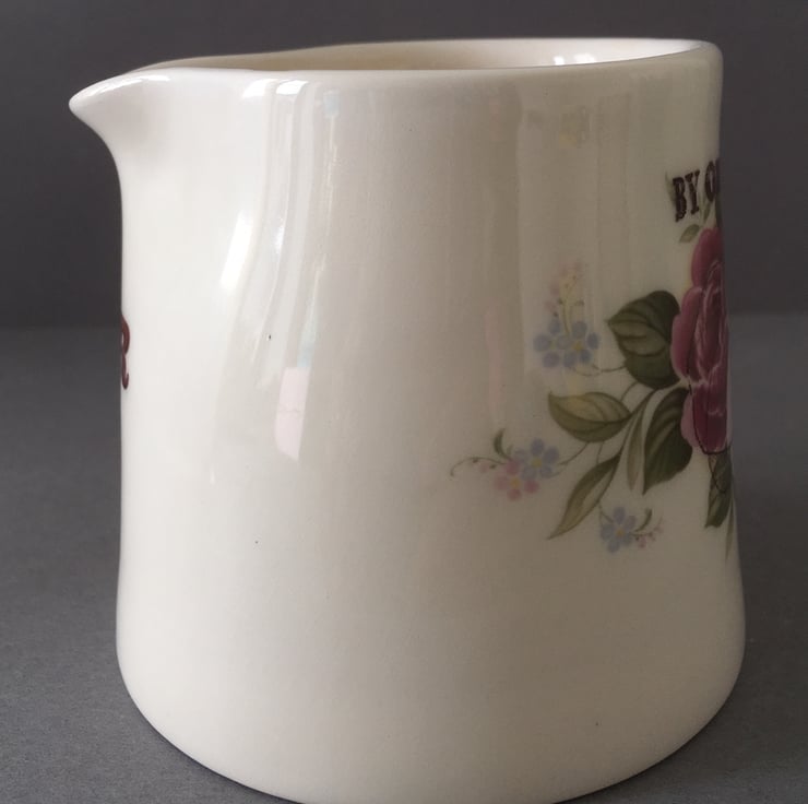 Handmade white/cream earthenware jug. This hand thrown jug has a simple, hand stamped effect font “Pour it” on the front under the lip. A vintage rose decal sits on top of a subtle flat cap underneath a glossy body. The, now famous command “By order of” sits with the rose decal. All inspired by, the dark and fantastic series “The Peaky Blinders”