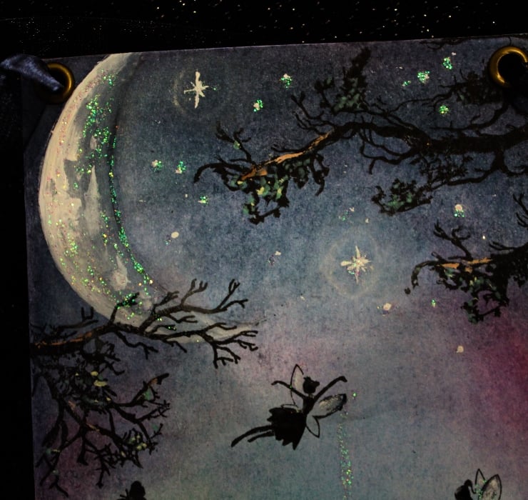 Each one features hand stamped fairy and woodland decoration the forefront of a hand painted crescent moon, a starry night sky.