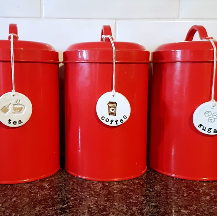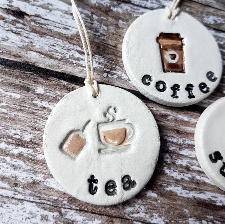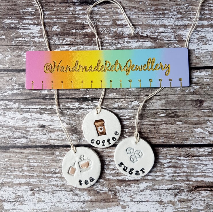 These Tea/Coffee/Sugar tags are hand stamped into air dry clay, then finished off using a dryer, and finally hand painted detail is added using acrylic paint. The tags are then sealed with a gloss varnish to protect, and have some baker's twine added to use.