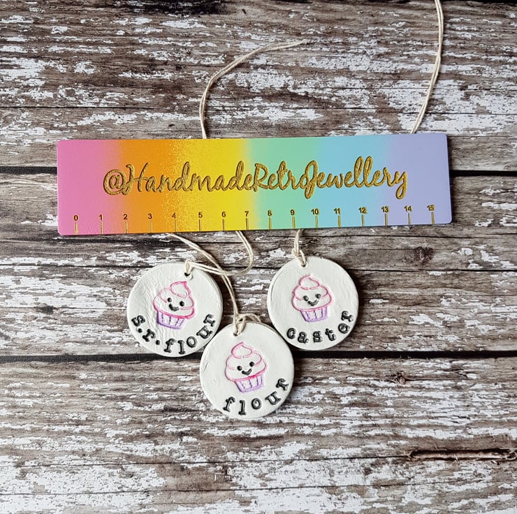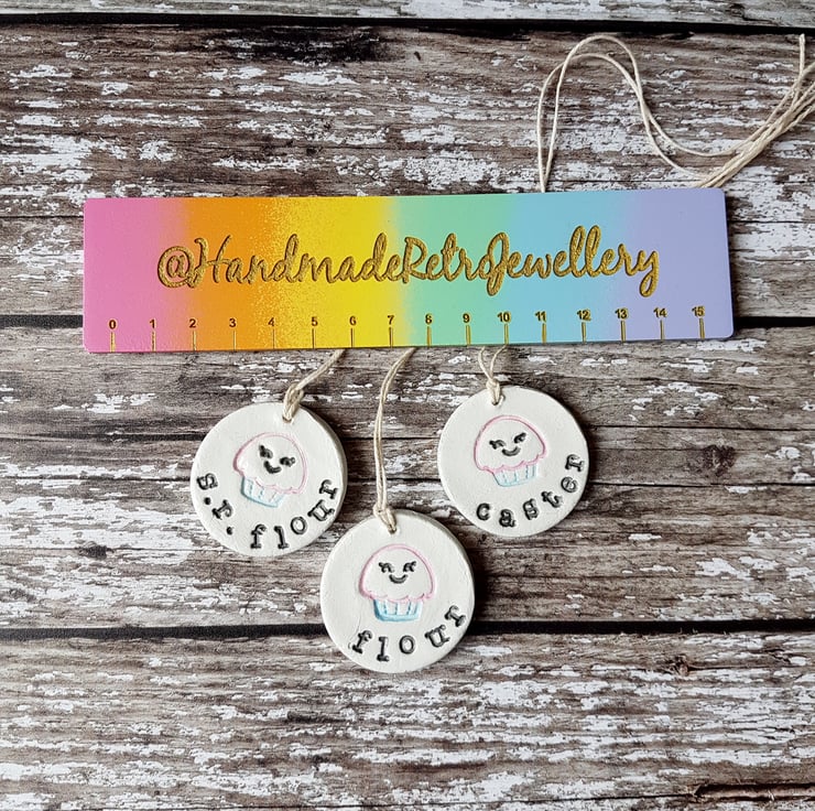 These home baking themed tags are hand stamped into air dry clay, then finished off using a dryer, and finally hand painted detail is added using acrylic paint. The tags are then sealed with a gloss varnish to protect, and have some baker's twine added to use.