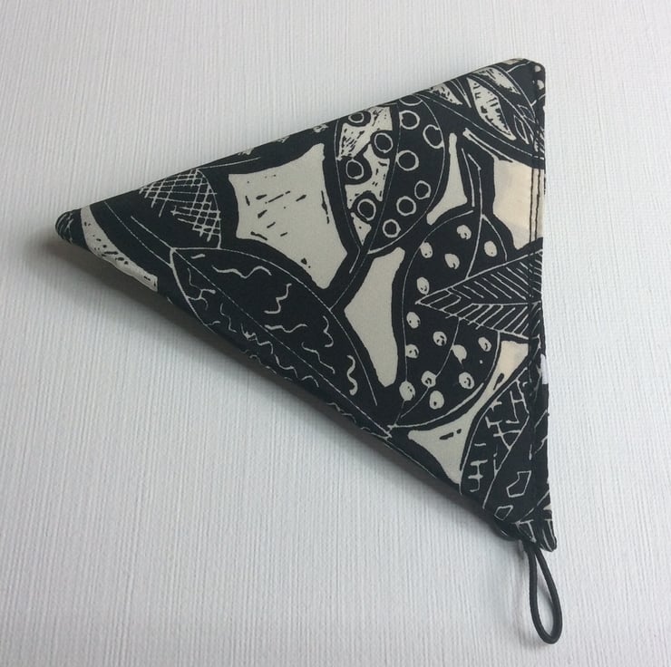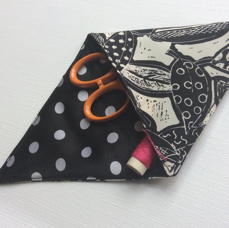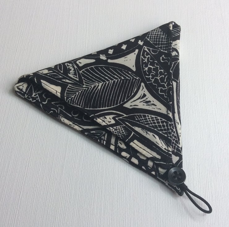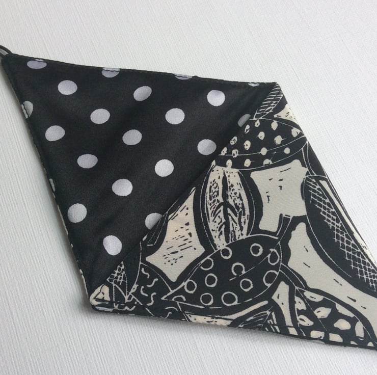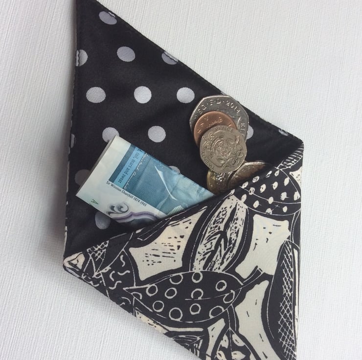 This small coin purse is perfect for change for the car park, cash or other small items that need to be kept safe. It is made from a black and cream silky fabric with a black silky lining with white spots. The purse is approximately 11cm x 11cm x 11cm. It has a black elastic loop and black button closure.