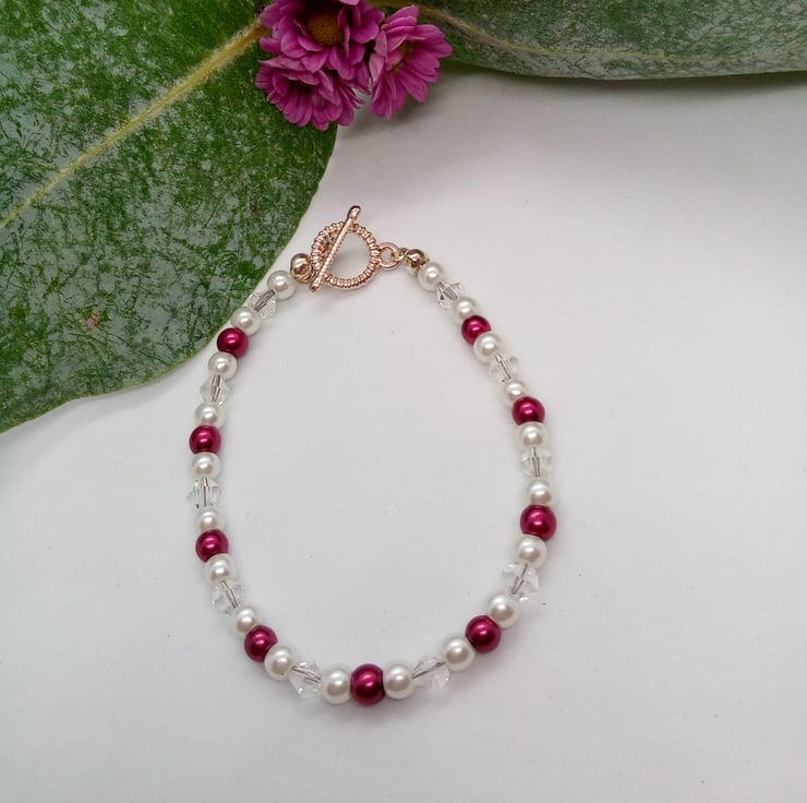 Burgundy and White Pearl and Clear Crystal Bicone Bracelet and Earrings Set, Pearl Jewellery, Birthday Gift, Anniversary Gift, Valentine's Gift, Mother's Day Gift