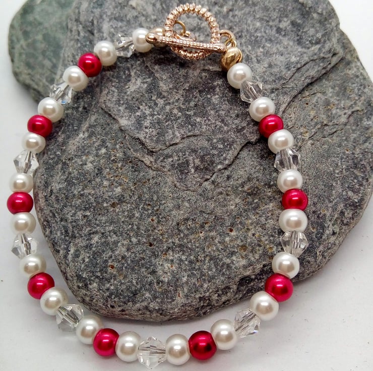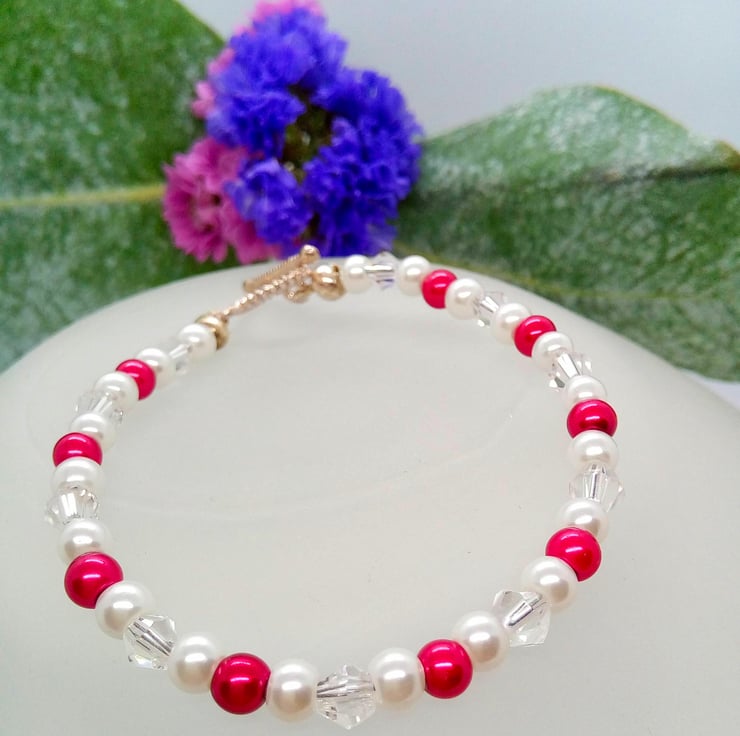 This beautiful bracelet and earrings would go well with any Spring or Summer outfit that you wear for a special occasion or that you choose as a gift for a friend or relative for a birthday, anniversary, Valentine's Day or Mother's day. It would also make a lovely treat for yourself. The bracelet is made using 4 mm white and burgundy pearls and 4 mm clear crystal bicone beads. It measures 15.25 cm (6 inches) long and it has a silver plated toggle clasp. The earrings have a 2 cm (0.75 inch) drop and are made using a 4 mm bicone crystal, two 4 mm burgundy pearls, a 4 mm white pearl and a 4 mm red crystal rondelle bead. They are hung on silver plated Ear studs. The bracelet and earrings will be dispatched wrapped in tissue paper in an organza bag and delivered to you via Royal Mail first class post.